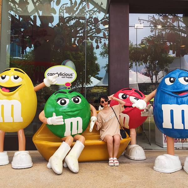 柱子上绑的都是大大小小的玩具糖果,特招喜。店门口有很多标志性的糖果卡通人物供游客拍照留念。先在门口合个影,准备晚上再进店好...“梦之湖”边上就是大名鼎鼎的“Candylicious”。