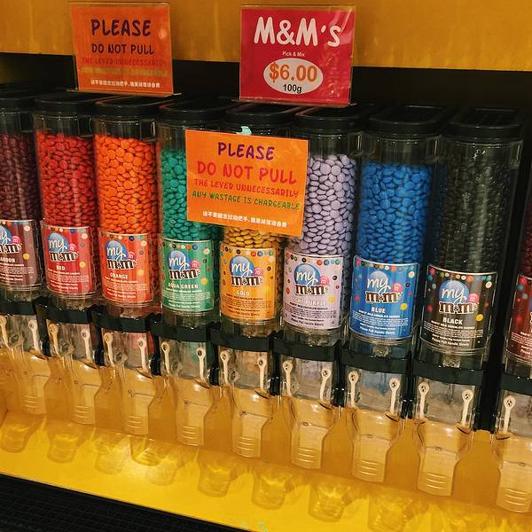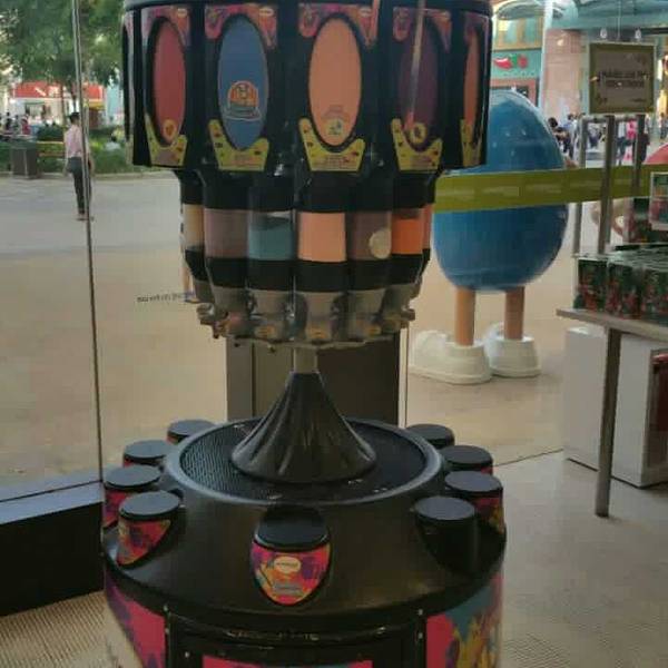 下图这种,我是第一次见,其实有点类似于国内7-eleven的思乐冰。顾客在柜台购买管子,随后自己在机器前随意装入糖果,但就这么点,也要新加坡币4元-8元了,送礼也不好看,只适合小朋友玩玩。糖果屋内部也是用五花八门的糖果布置得琳琅满目。墙上由糖果柱围城的墙让人很有合照的冲动。进门右手边是冰淇淋区,各色各样冰淇淋让我垂涎三尺呀!在这里,除了可以买糖果外,还有很多跟糖果相关的饰品、钥匙扣、玩具之类的。可以买来当手信送给不喜甜食的朋友。我在这里就买了Cup cake 样钥匙扣、两个奶瓶装的M&M巧克力、紫色装的KISSES巧克力,价格30-40元不等.
