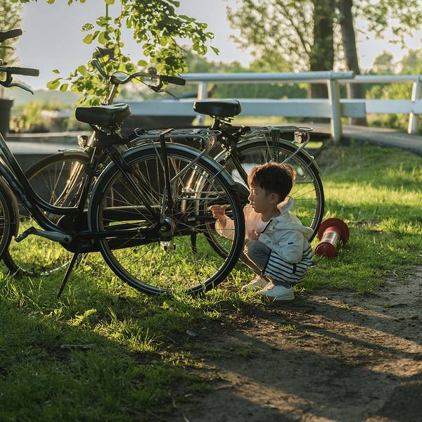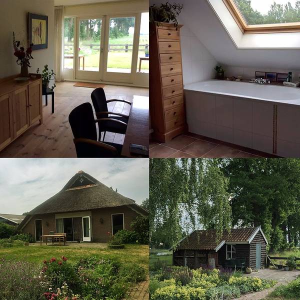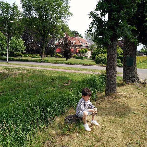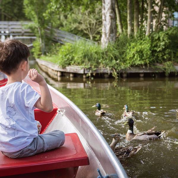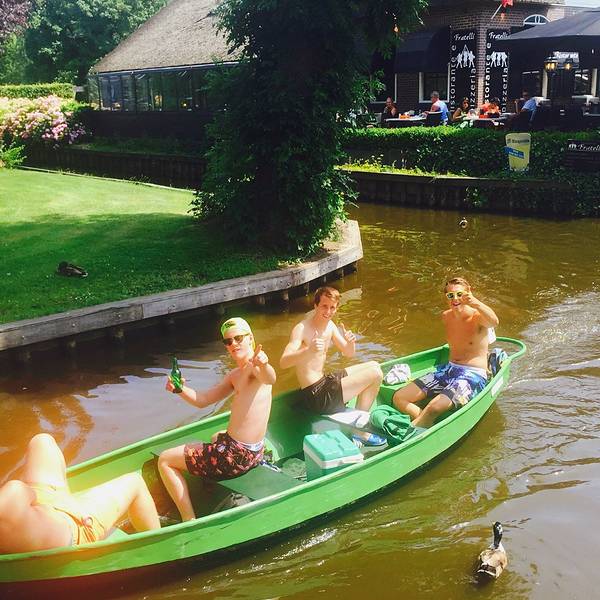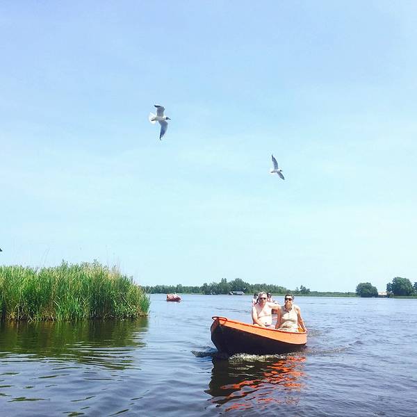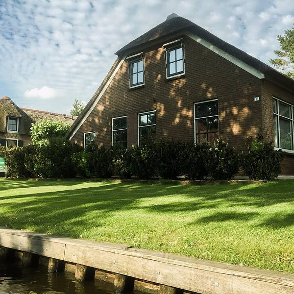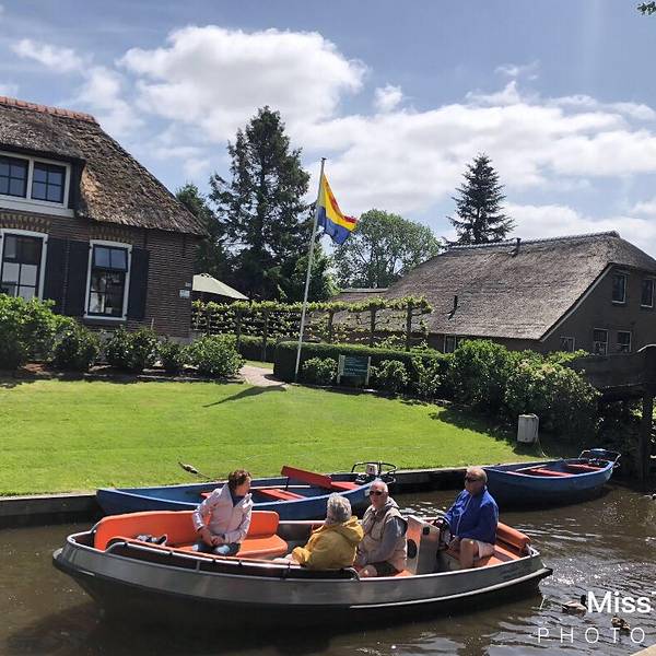 储备好能量,第二天就出发去30公里处的羊角村喽。记得有一次看到一个世界最糟糕发明的评选,汽车俨然成为Top1,当然最根本的原因是对环境的无止境和极度地践踏,人类对它又爱又恨。有一个地方,700年来,不修公路,只有纵横密布的河网,176座连接个户人家的小木桥,这就是羊角镇。小时候的美术课上,我记得画的最多的就是,“白云蓝天飞鸟,小桥流水人家”。羊角村,满足了一切幻想,是世外桃源,是儿时记忆中的田园人家。羊角村有“绿色威尼斯”之称(也有人称“荷兰威尼斯”)。“羊角村”这个名称得于当时一群挖煤矿的工人定居於那里,他们的挖掘工作使得当地形成了大小不一的水道及湖泊。而在每日的挖掘过程中,除了煤,他们还在地下挖出许多“羊角”,经过监定确认这些羊角应该是一批生活在1170年左右的野山羊。因此,他们便将那里称作羊角村,该名称一直保留至今。居民为了挖掘出更多的泥煤块以外卖赚钱,而不断开凿土地,形成一道道狭窄的沟渠。后来,居民为了使船只能够通过、运送物资,将沟渠拓宽,而形成今日运河湖泊交织的美景。同样是贫瘠土地,同样是过度开采,同样是重污染的煤矿业,荷兰人用了适合羊角村的方式修复了曾经的创伤,结果美成了一个童话,不得不让人羡慕和引发深思。羊角村最适宜的游玩方式是坐船,当然也有人租自行车骑行的。坐船的价格大概一个小时15欧,2个小时25欧。一个小时是小圈,二个小时是大圈环外湖。可以按照一个小时先付钱,回来如果超时了再补就好。按照我们固有分风格,到达的时候也是快下班了(避开人流高峰),等想租船的时候租船的公司已经下班了,可是我们不死心,一路问一路找,还真找到一个老太太还在河边,抱着唯一希望一问,还能租给我们,这下可把巴乔开心坏了。 插一句,为了保护环境,租的船都是电动的,无污染,这点在后面的旅途中也经常遇到,连国王湖那种载几十人的大船都是电动的,所以环保啊,是方方面面的。