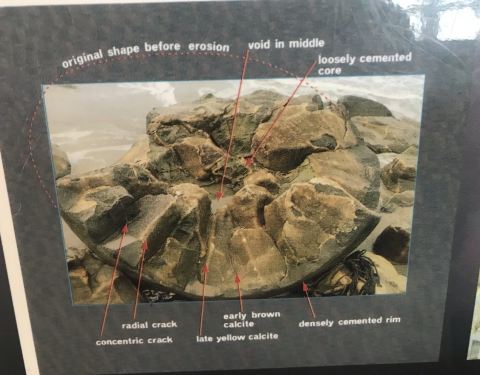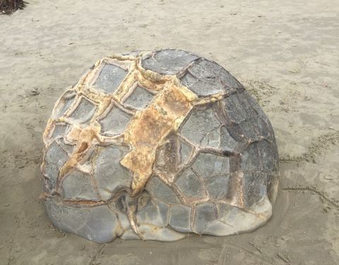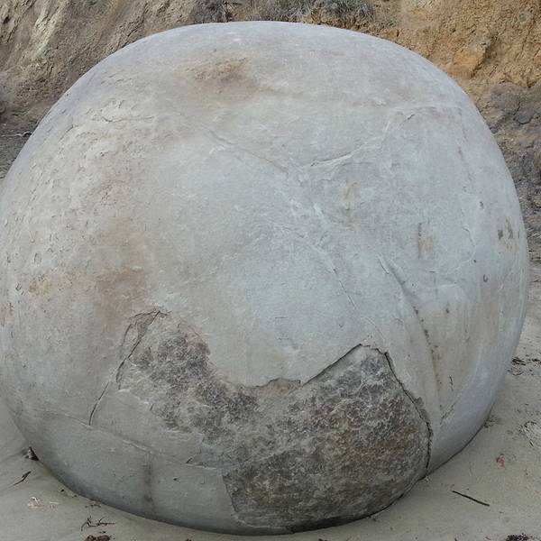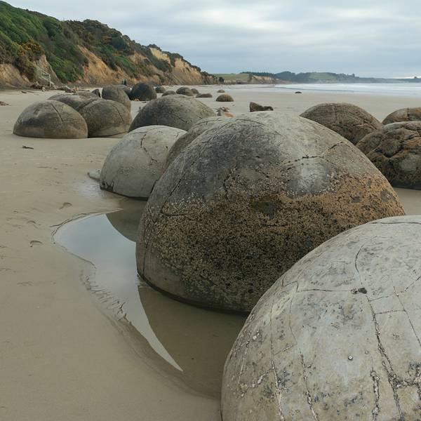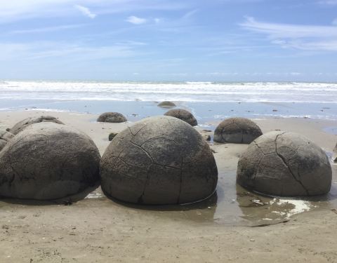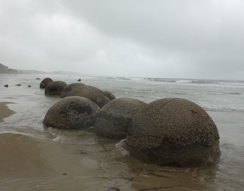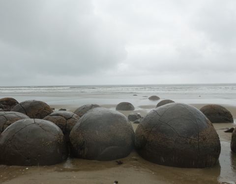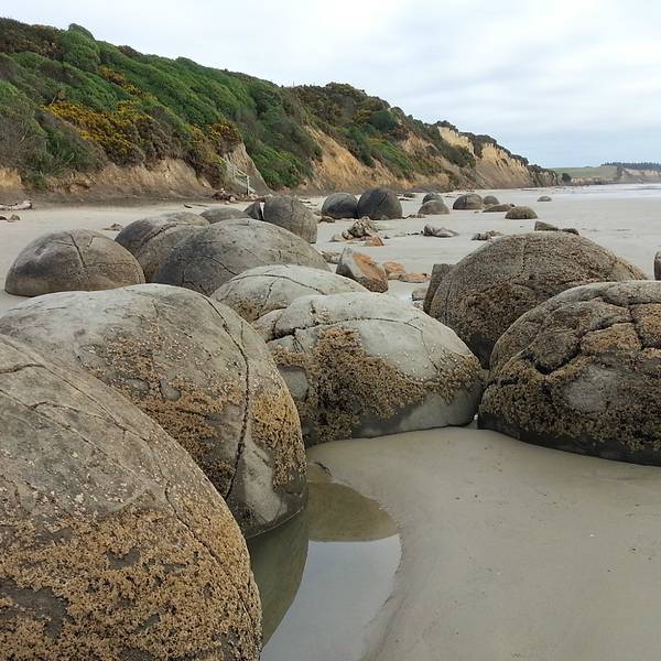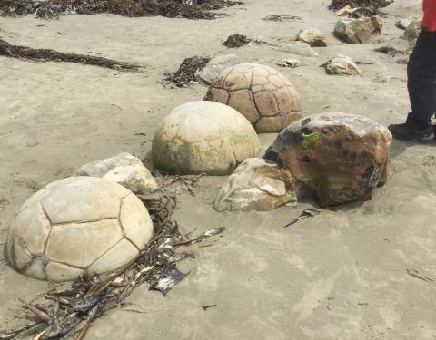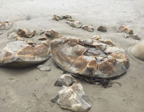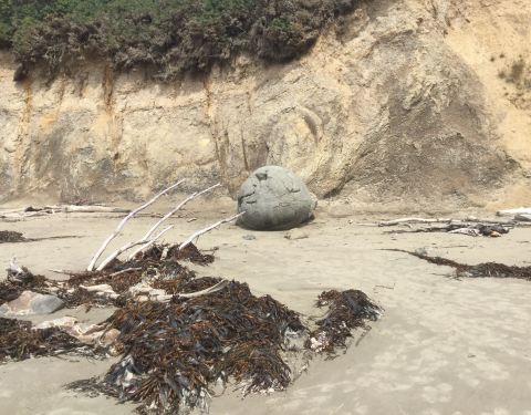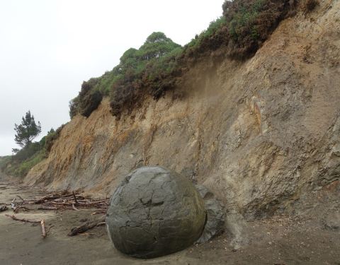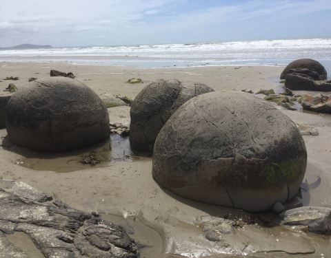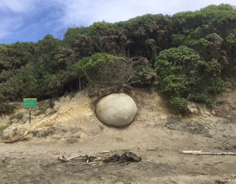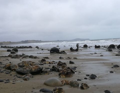 海滩上散布着很多圆形巨石,也有一些大圆石分布在砂岩峭壁的周围,有的巨石重达数吨,直径可达一米以上海滩上散布着很多圆形巨石,也有一些大圆石分布在砂岩峭壁的周围,有的巨石重达数吨,直径可达一米以上。关于大圆石的来历,毛利人自有传说。科学家的解释是这些大圆石是方解石凝结物,形成于六千五百万年前。