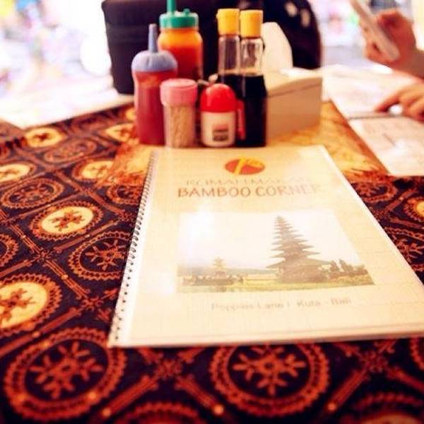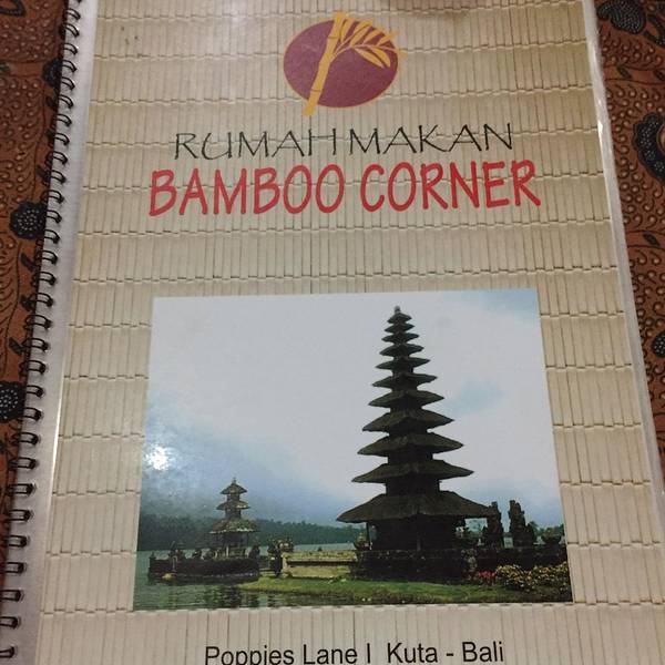 为了寻找攻略上推荐的一家餐厅,我们误打误撞走进了一条小巷,看到一只小喵用好奇的眼神打量着我,偷偷给它拍了一张照片,爱喵心切的我,经常会在旅途中发现它们的足迹~终于,在路人的指引下找到了这家餐厅,中文名译过来叫做竹子餐厅,来这吃饭的中国游客并不多,一般都是老外,但据说这家店物美价廉,味道还很不错。Bamboo corner餐厅位于著名的Poppies Lane I的中段,离海滩步行5分钟左右,餐馆的外墙和天花板是采用竹子或竹篾片装饰而成。看这菜单多实惠,天气炎热正好也走累了,歇一歇吹吹风,吃顿海鲜大餐,心情极好~这里最有名的是海鲜篮,有虾,有鱼,海蟹,薯条等等,两个人吃分量都足够,算一下才人民币40左右,好实惠~叫上一杯鲜榨的芒果汁,消暑解口,这顿午餐让我吃的十分过瘾,始终念念不忘! 地址:Jalan Poppies 1,Kuta