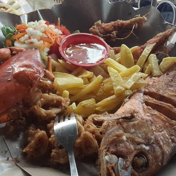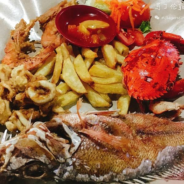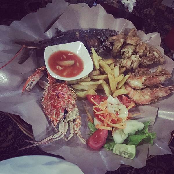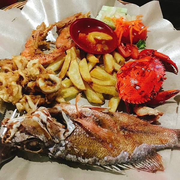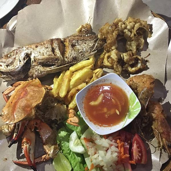 海鲜篮(Seafood Basket),Rp.85000=¥45,海螃蟹,海鱼,海虾和鱿鱼四种海鲜炸制,还有好吃的薯条,配上酸甜的蘸汁,非常好吃。