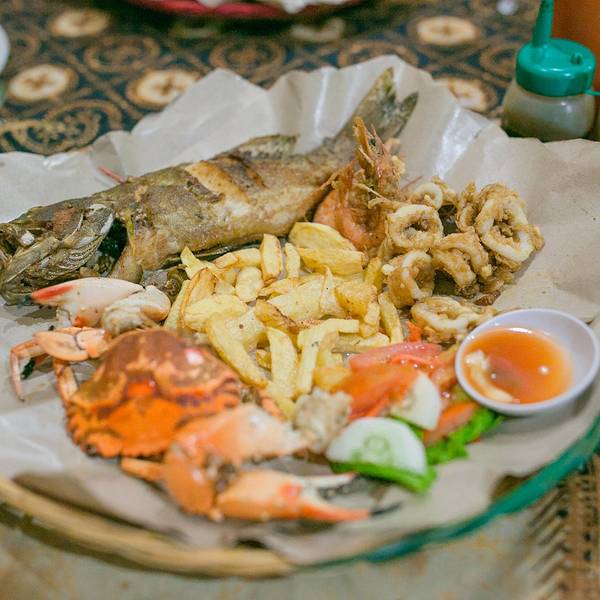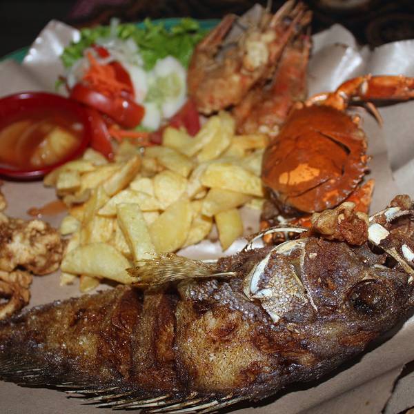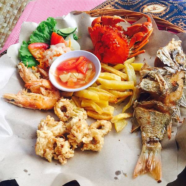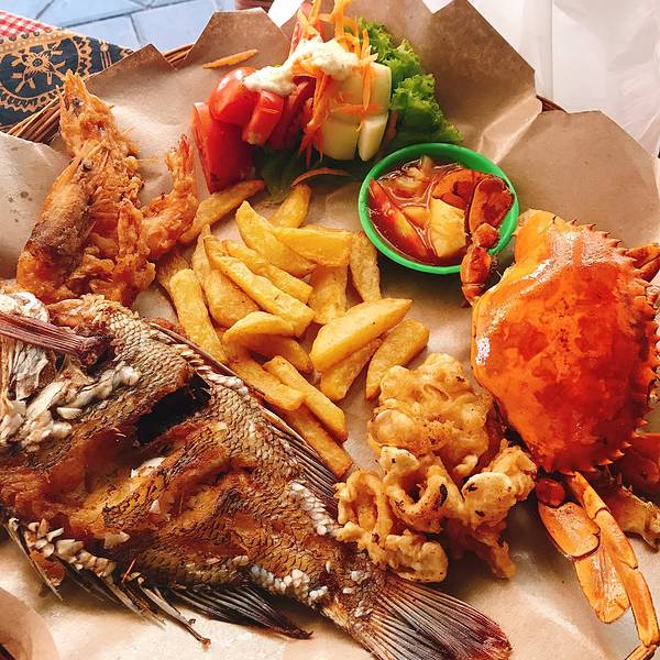 位于 Jl Poppies Lane I No 26, Kuta(谷歌地图导一下,超级准),库塔本土小店,印尼菜色,庙小名气大,便宜到没有朋友,海鲜以炸制为主,性价比超级高。 龙虾(lobster)Rp.150000=¥79,一对大大的龙虾,看起来就相当有食欲,分量大,肉质鲜美,配菜是薯条,特别棒。 海鲜篮(Seafood Basket),Rp.85000=¥45,海螃蟹,海鱼,海虾和鱿鱼四种海鲜炸制,还有好吃的薯条,配上酸甜的蘸汁,非常好吃。 印尼炒饭(Nasi Goreng Spuer),Rp.20000=¥10,炒饭上有一层巨大的虾片,米饭和虾,青菜配以特色酱料超值而成,比国内的印尼炒饭好吃一百倍。 牛油果汁(Avocado Juice),Rp.15000=¥8,强烈推荐,太好喝了,性价比超高,香甜牛油果汁里还有巧克力,丝滑浓郁,香气逼人。 柠檬果汁(Lemon Juice),Rp.8000=¥4,很清爽的果汁,和油炸的菜品一起享用,特别解油腻。 来巴厘岛游玩的朋友千万不要错过这家,很正宗的当地特色海鲜~
