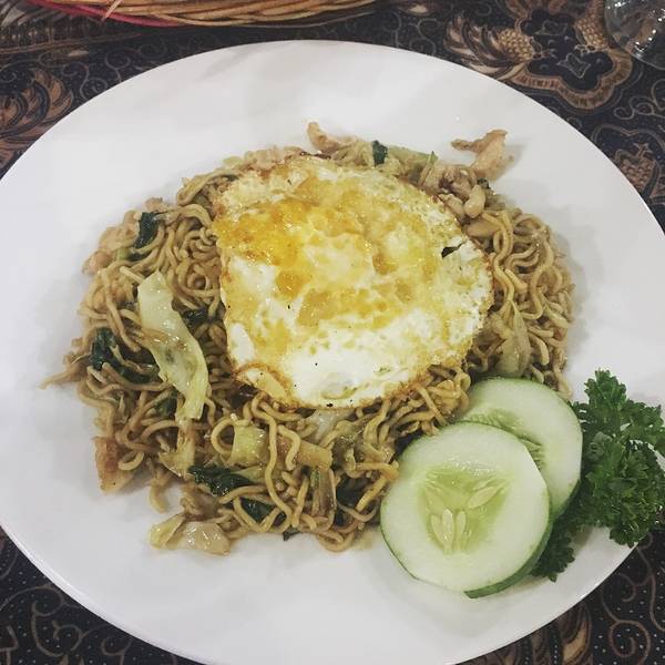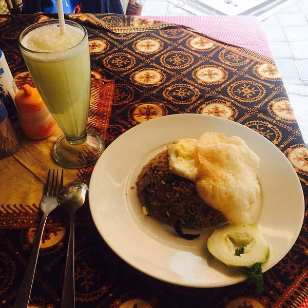 印尼炒饭(Nasi Goreng Spuer),Rp.20000=¥10,炒饭上有一层巨大的虾片,米饭和虾,青菜配以特色酱料超值而成,比国内的印尼炒饭好吃一百倍。