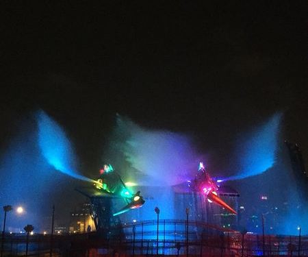 晚上八点档,是免费的灯光秀,持续十分钟。免费的,因为从环球影城出来太晚了没看到时光之翼表演,但是还有水上仙鹤!很精彩的表演,一定要提前去,占好有利地形。就是手机太差,晚上照相效果不好-_- !