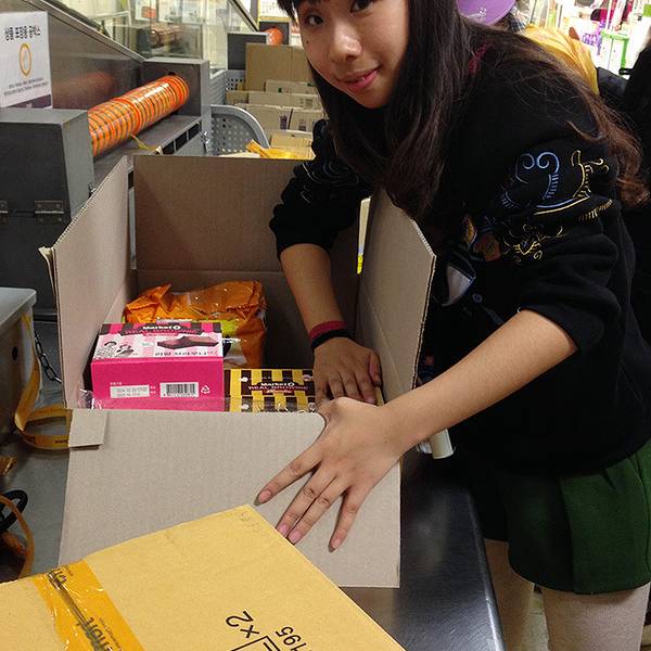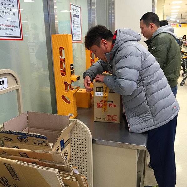 按照你购物东西多少自己选择纸箱,旁边有胶带可以自己打包,十分方便。各种看不懂的食物