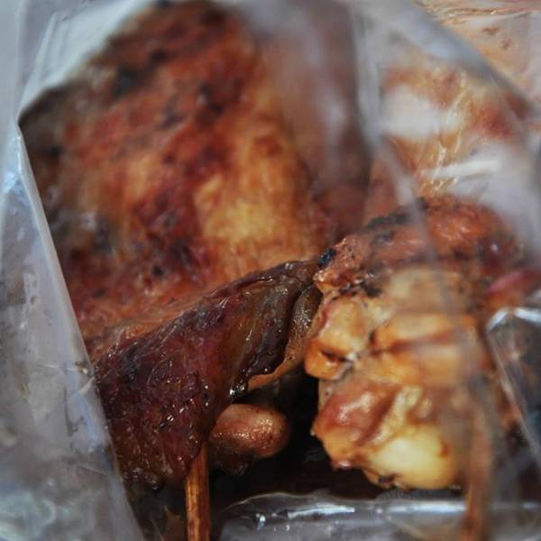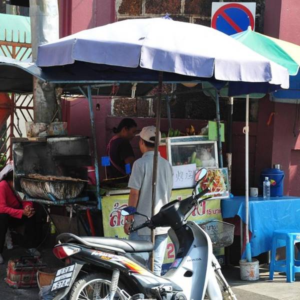 第一餐午饭,在偶遇的大排档解决。吃完发现这间没有名字的小店也是攻略上推荐的古城一家有名的店。经营的是最简单的泰餐。类似我们这里牛肉汤配米线或者面条或者白饭。据说泰国的面没有米好,但是面比米贵。因为不产。米粉儿最便宜,但是最好吃。考虑是第一餐嘛,稳妥起见还是点了米饭。因为看到邻桌的当地人点的米饭。点了一份猪肉排骨+鱼丸汤头的,一份牛肉丸牛肉汤头的,60B一份(看了菜单,点粉是50b一份)。味道超鲜美。汤清无油。但是肉都好大块儿。里面配了豆芽和一些当地的新鲜蔬菜。特别赞一下桌上的辣椒粉。喜辣的人必加。瞬间让你的鲜汤up一个档次,什么档次?封喉吐火的档次。 等待的空当儿,到对街买了一个烤的大鸡腿45B,一个巨大的整鸡翅25B。看到有青木瓜沙拉,纠结了半天没有尝试。真心不是我的味型。烤鸡超好吃。甩奥尔良鸡翅之类的几条街,鸡腿我只咬了一口,惊喜地说了一句,这个超好吃。就被TT夺过去两三口就吃成骨头架子了。这一餐,不贵,但很满足。就是泰米比较硬,不好消化。所以吃了一餐很久都不会饿。