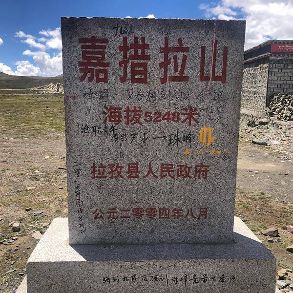 嘉措拉常常和珠穆朗玛峰联系在一起 因为,凡是打算从珠峰北坡登顶者,他们前往这座世界第一峰的必经之路就是嘉措拉 嘉措拉就是珠峰的门户,嘉措拉山位于国道318上,是通往珠穆朗玛国家公园的必经之路既然已经来到了嘉措拉山口,也就意味着,我们要进入珠峰的保护区 但是要抵达大本营,还有很长的一段路途在这里,只是停下来拍照,顺便上个洗手间的,哈哈 旅行社为了预防司机疲劳驾驶,在行驶3小时左右,必须停下啦休息20分钟在这里,同样放有珠峰自然保护区的石头标志,告诉大家,你们抵达珠峰保护区了哦