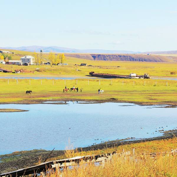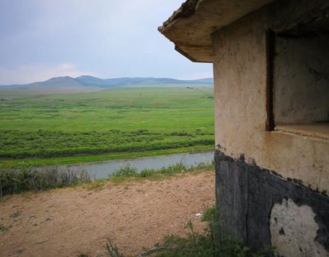中国与俄罗斯的界河,边境周围是广袤的草原和俄罗斯风情小镇。