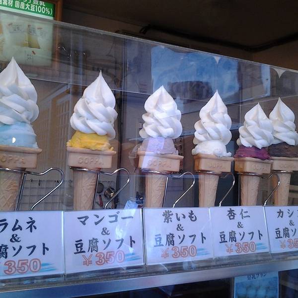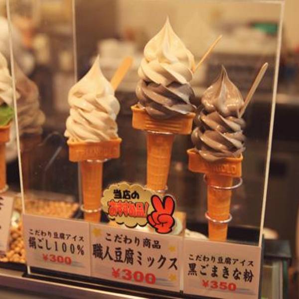 终于到了~没什么人排队,招待我们的服务员是东北人,建议我换掉了本来打算吃的凉豆腐,换了热的。吃的就是这两样比较有名的,胡麻豆腐有的人说味道怪,我不太喜欢发酵的味道,就没尝试。和大家的评价差不多,荞麦面不错,汤头也清淡,鱼比较腥,不过我不反感腥味儿,豆腐就是白水煮的,没什么味道,让lg吃了。旁边有一家卖豆腐冰激凌的,看着生意清淡,出于同情买了一个。豆腐冰激凌在日本还真是超常见。反过来也不会掉,口感有点Q,非常豆腐。>v<