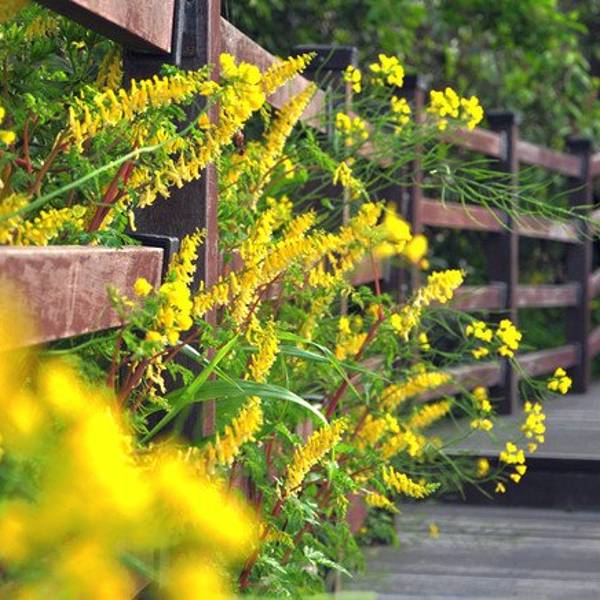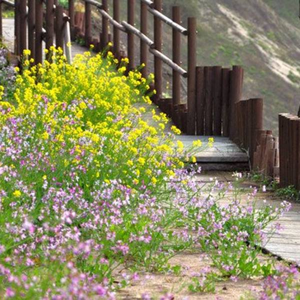 海边的木栈道小路。早上的沙滩人很少,偶尔有几个冲浪划水的人。很喜欢这种黄色的串串花,可惜不知道名字这里是我在济州看到的唯一一个沙滩,砂质很好,不过好像是人造的。
