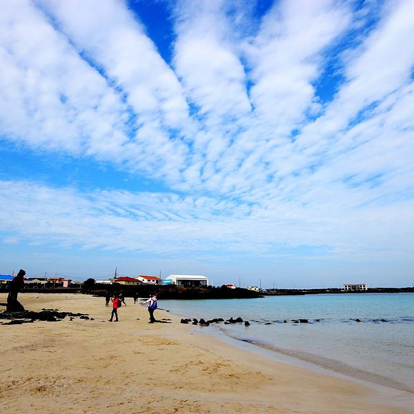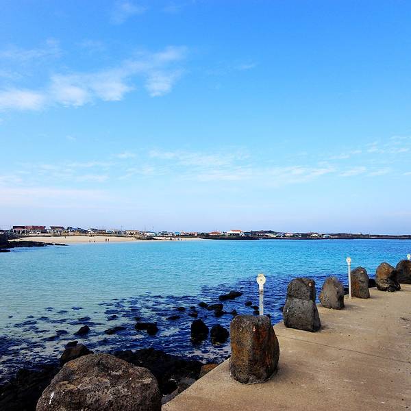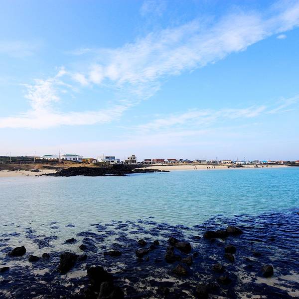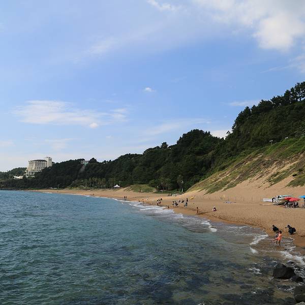 中文海水浴场沙滩长560m,宽50m,倾斜度为5度,平均水深1.2m,其中如箭般细长弯曲的沙滩和拥有黑、白、红、灰四种颜色的傻子是其最大的与众不同之处。 沙滩与济州岛特有的黑色玄武岩交相辉映,景色尤为美丽,很多电影和电视剧都曾在这里进行过外景拍摄。海水浴场的右侧是如屏风般的绝壁,内有长达15m的天然洞窟。沿海岸绝壁前行,可以看到很多稀有植物。