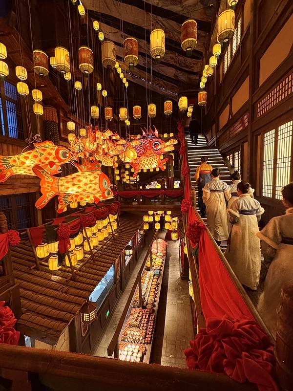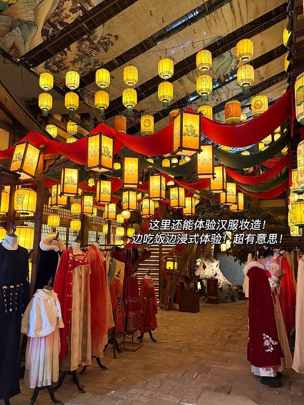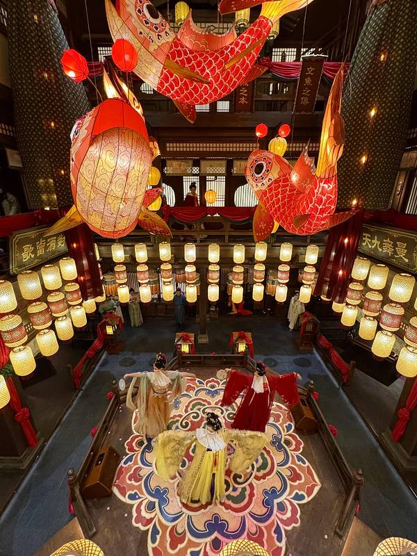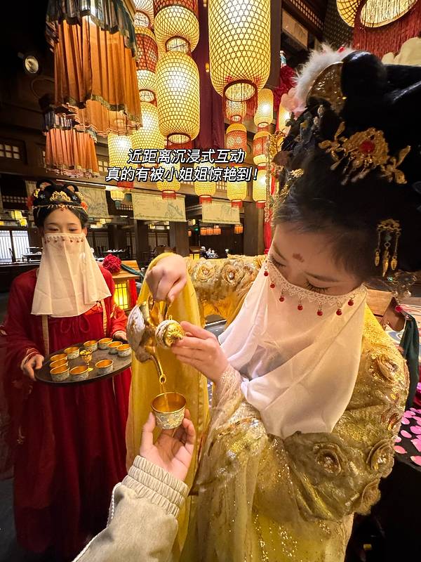 出自横店设计师之手!!简直一秒穿越到唐代!!引入眼帘的吊顶鱼灯、青瓦木梁、红灯高悬感觉走进了古装剧片场!穿越感拉...长沙首家!!!8000平沉浸式唐代古风餐厅!!