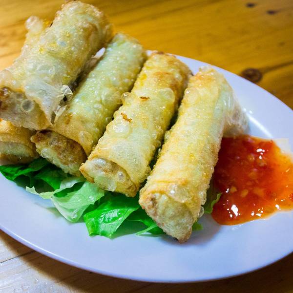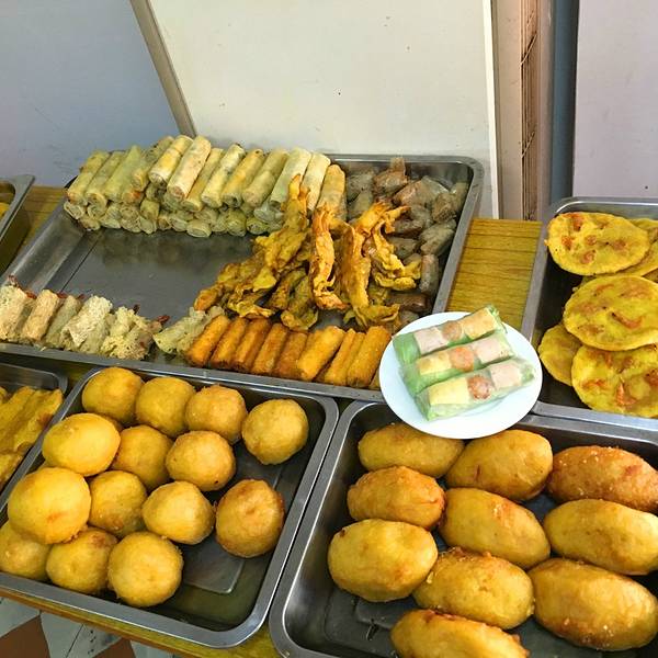 但是来都来了,只能找点东西吃啦~姐们找了好久,终于找到一个看得顺眼的店。进去一看都是煎炸的东东,看着金碧辉煌,我们少年人是很有食欲啦,要了一碟春卷,10块钱,就是图片上白色碟子的部分。外面挺脆的,里面就是一些蔬菜。如果在我们自己家呢肯定是有点贵了,但是景点嘛,贵点也能理解。妈妈吃不了煎炸的东西,要了一份叉烧粉,8元。后来又去吃了越南卷粉。卷粉酸酸甜甜,特别爽口,价格也不算贵,值得尝试一下。街上有一家糖水店,叫24栋糖水,特别火,永远排好长的队,我们每人要了一份板栗芋圆,好吃,用料很足。走到侨港风情街的尽头就是一个停满渔船的港口,看着也是非常带感的。