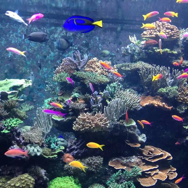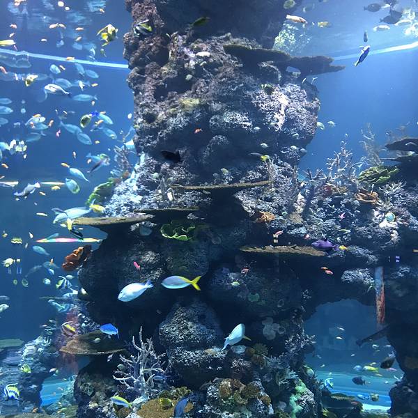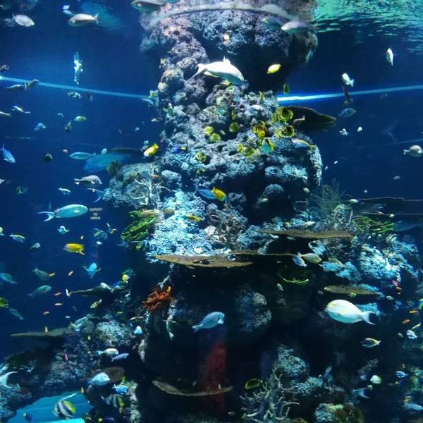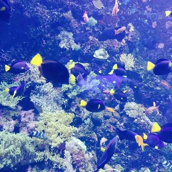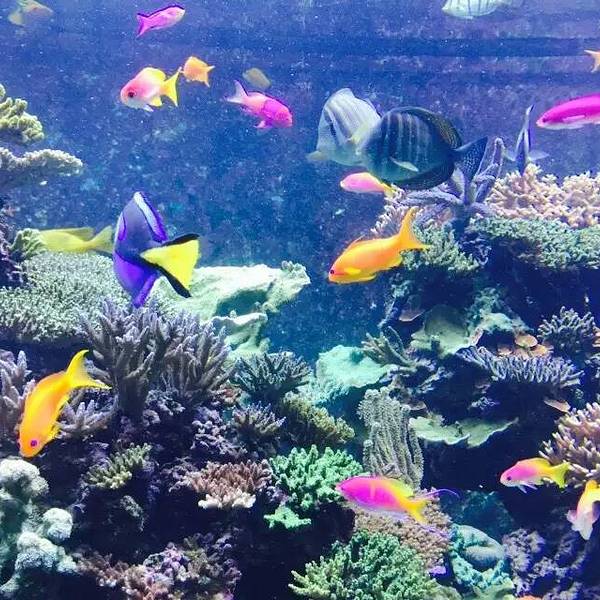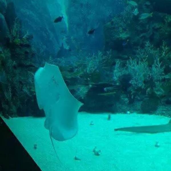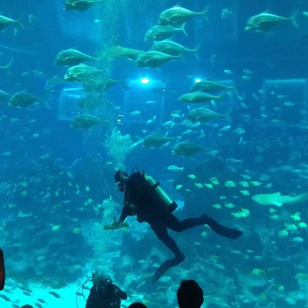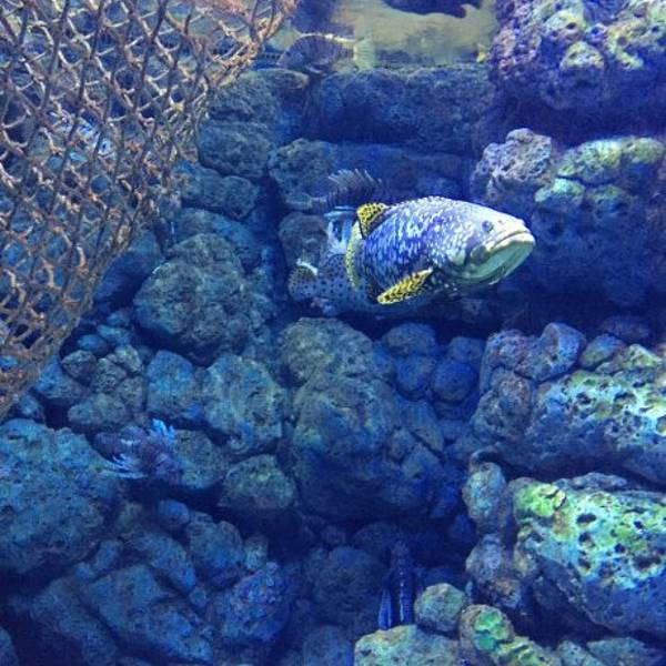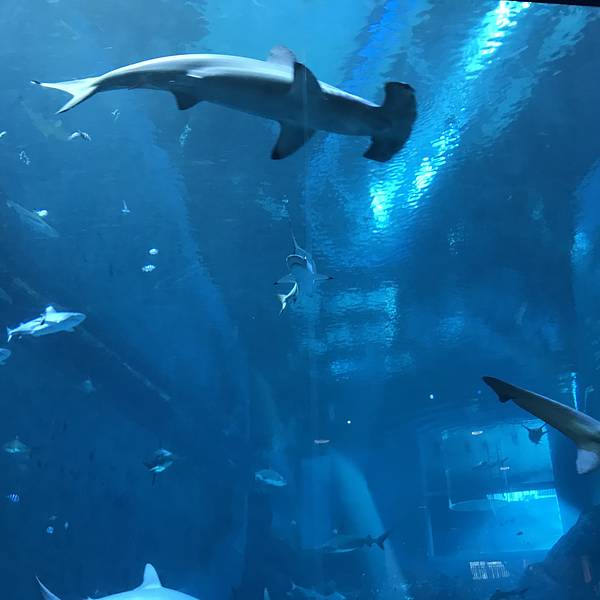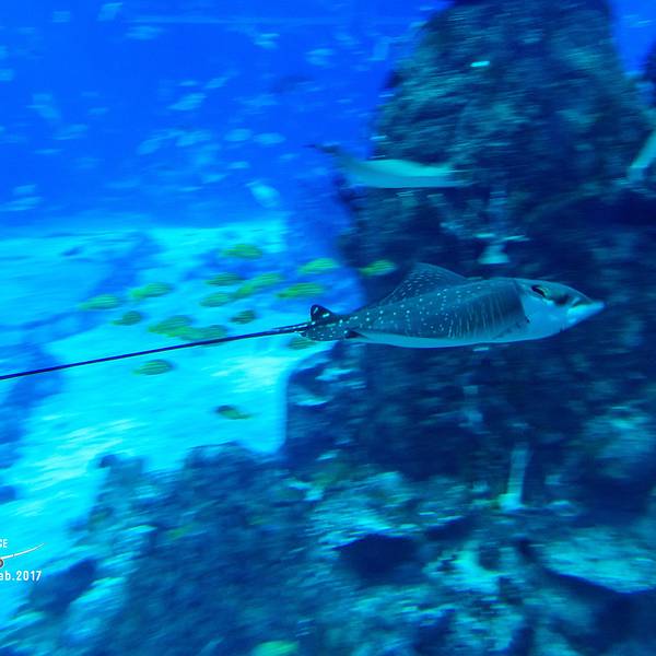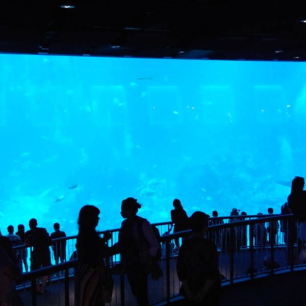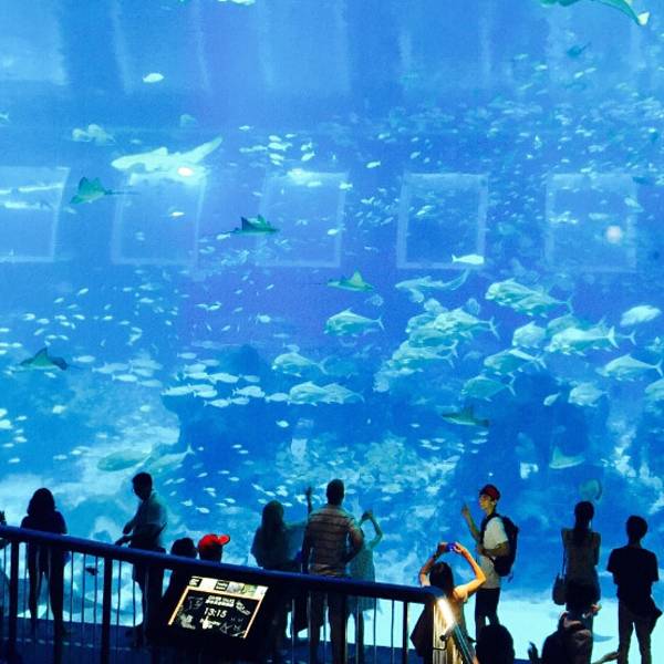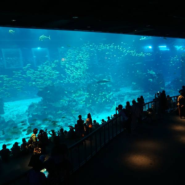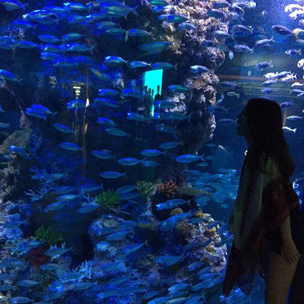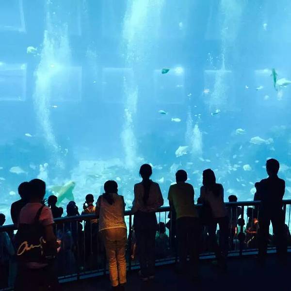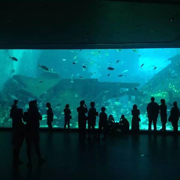 站在巨大的水族观景窗前,与鬼蝠魟、豹纹鲨等海洋生物面对面。