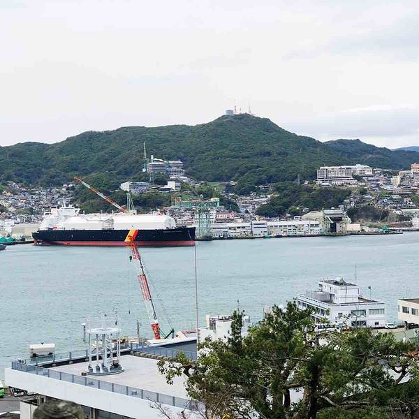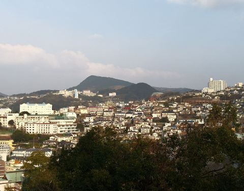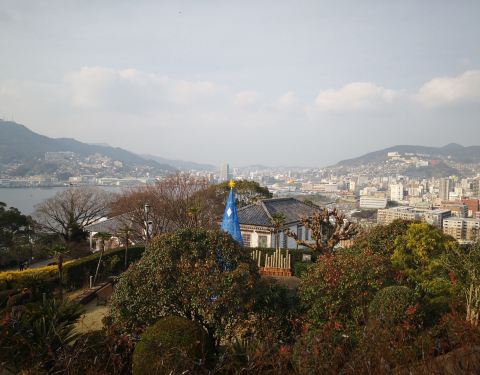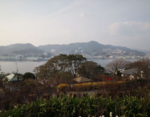 向远处眺望,一览无遗的长崎港和女神大桥,即使是阴天里暗沉沉的天色也不能减少它的美。
