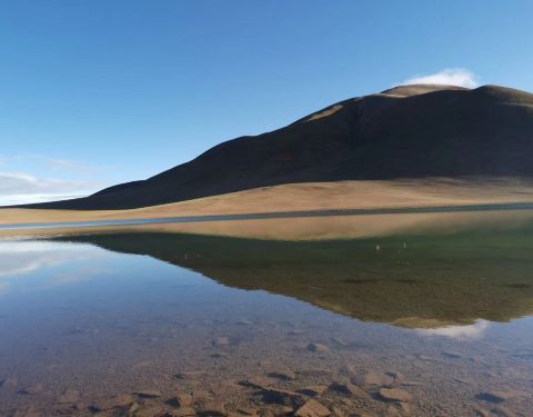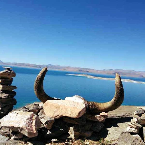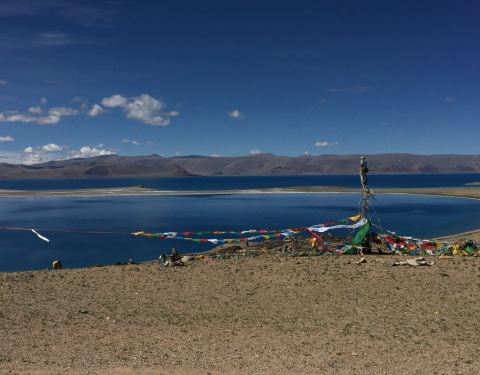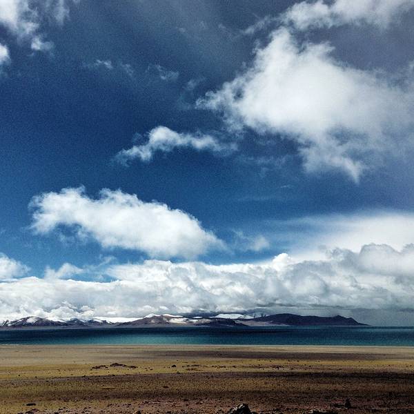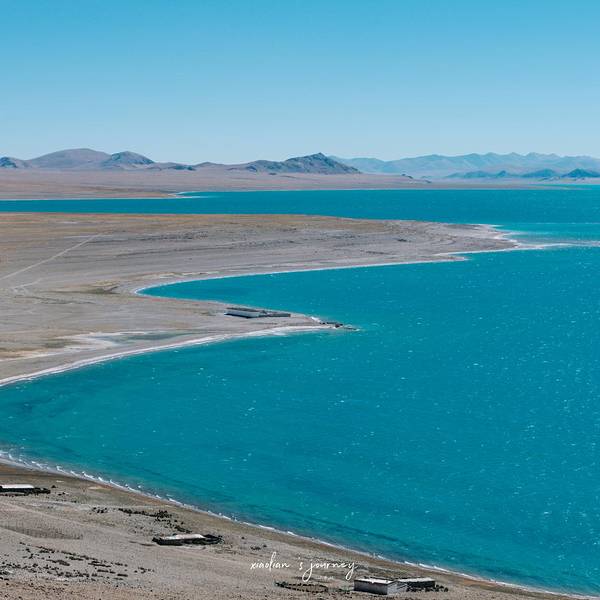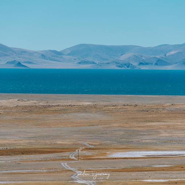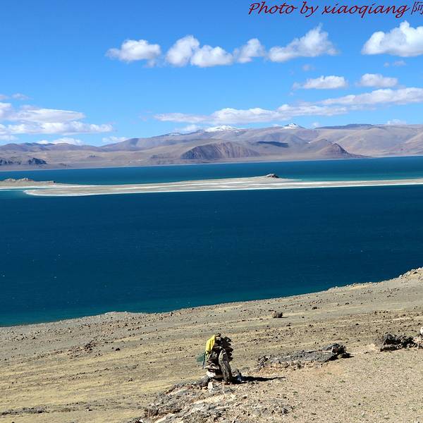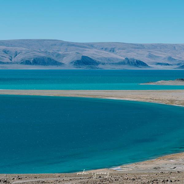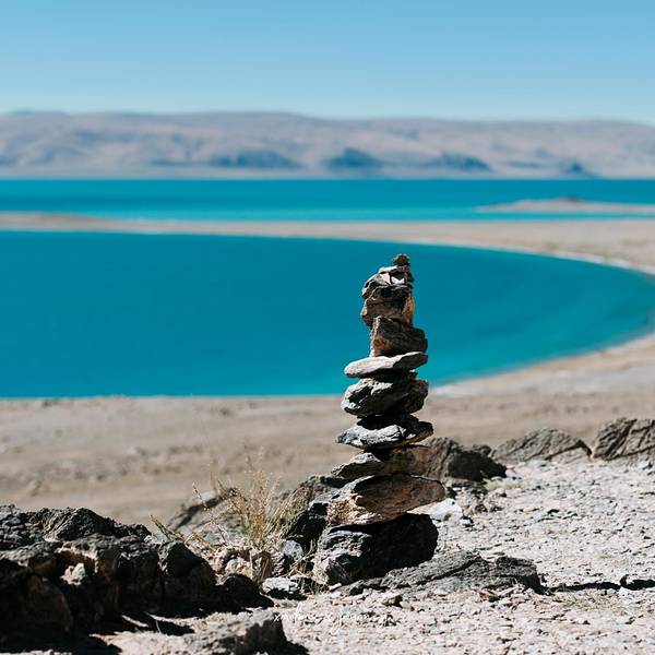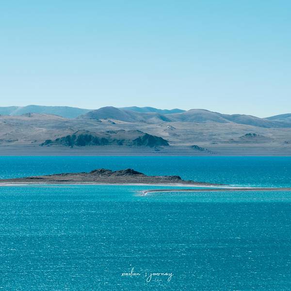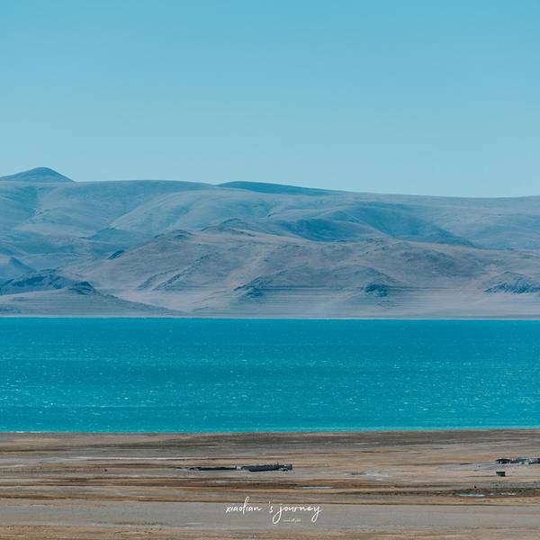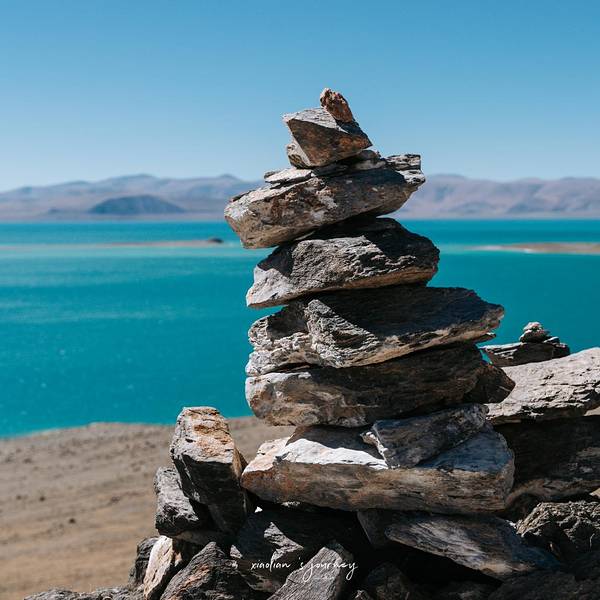 没有云的湖边,画面很简单,除了大地与湖水的蓝,就只剩下土黄的大地,唯一的点缀也就是那一块一块石头垒成的玛尼堆了。扎日南木错湖水实际的颜色其实要比照片拍出来的更好看,我仍记得第一次看到它的模样,在大片大片荒芜的土地中间镶嵌着一抹沁心的蓝,即便风吹的紧我依旧站在风口看了它很久。