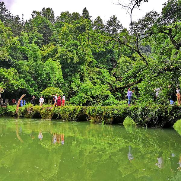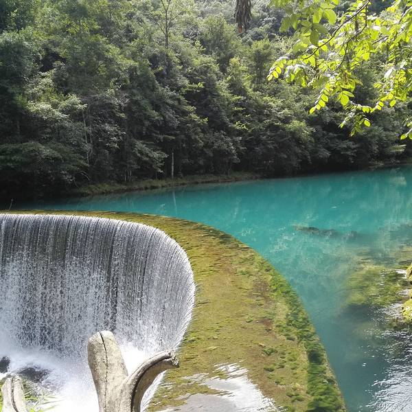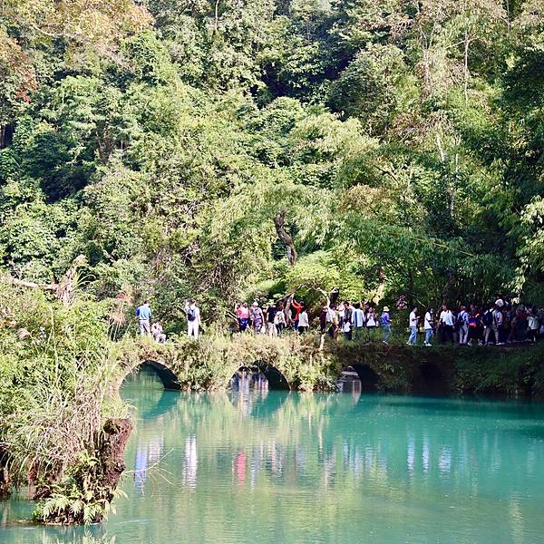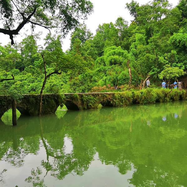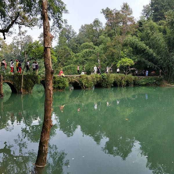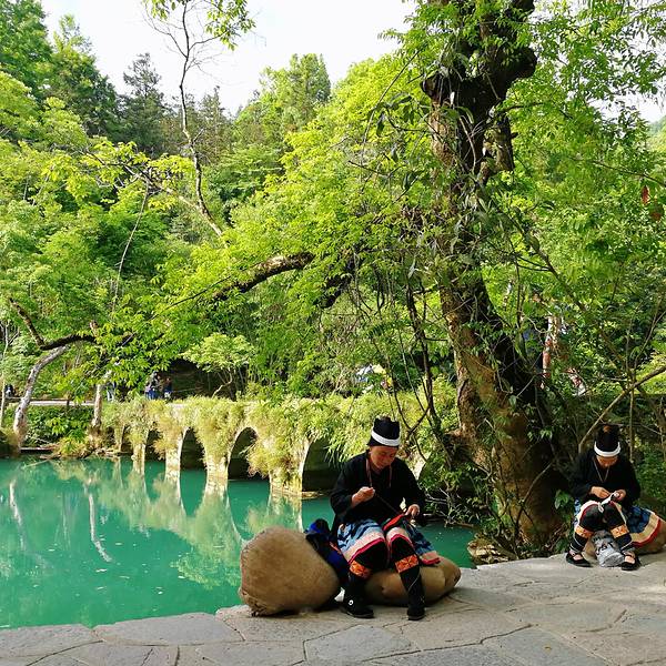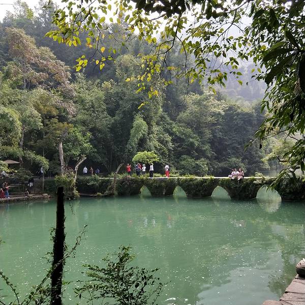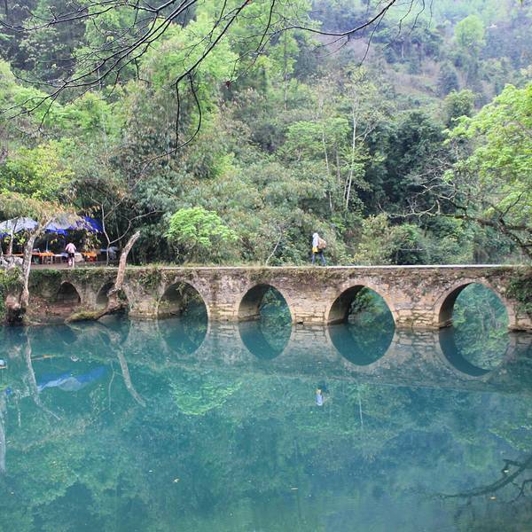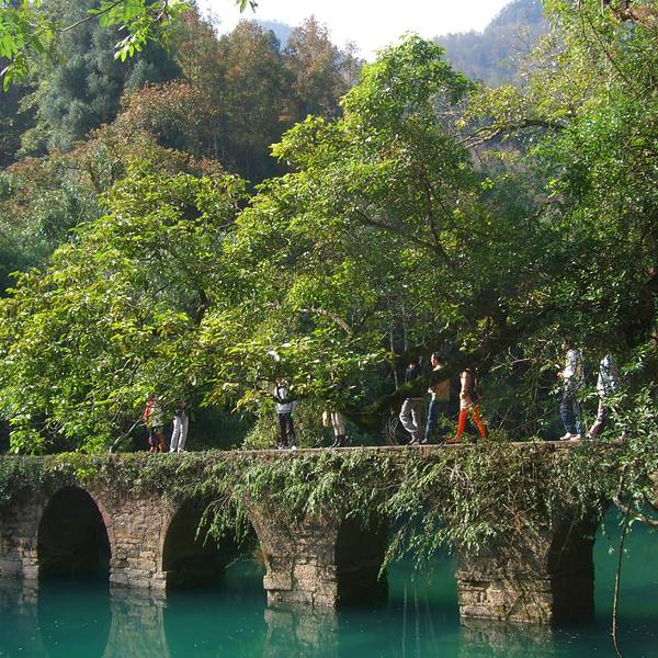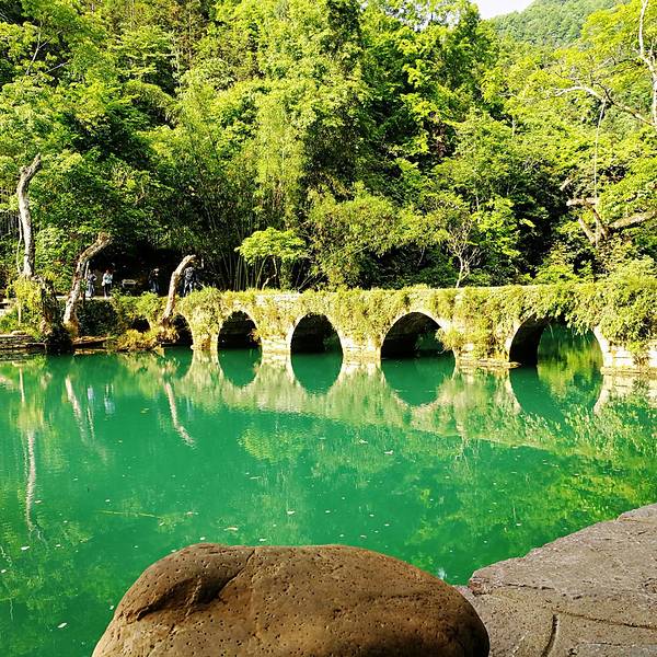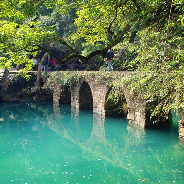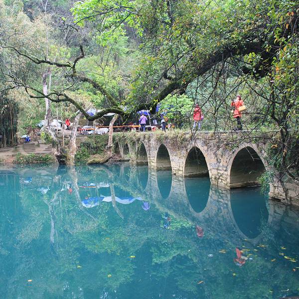 从68级跌水瀑布一路走来,路边驻足的人就越来越多了,随着最后一阶跌水后河流变得平缓,水的蓝绿色也变得越来越沉淀,水中偶尔露出一截朽木或者木桩,驻足观之,很是有一股说不出来的宁静的感觉。顺着静静的河水再往前就到了小七孔古桥,桥体结构没有什么独特的亮点,但是古桥经过岁月的沉淀,青苔藤蔓的点缀再配上这一潭粼粼碧水,两岸的树垂下它们的树枝缠绕在桥体,顿时一种悠然气氛自然而然的就荡漾开来。也许一路都是高山流水,急湍的河流,突然静下来的景致顿时让人心中都被洗涤了一番,只能说走到这里,不虚此行!