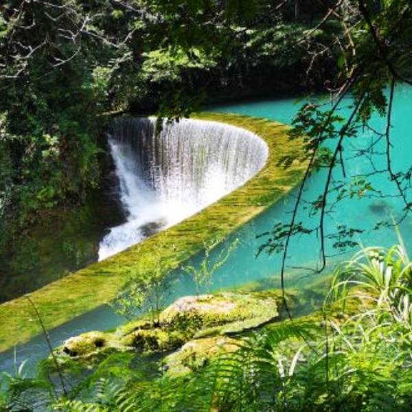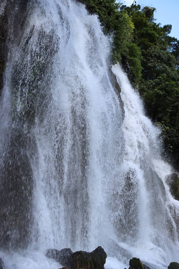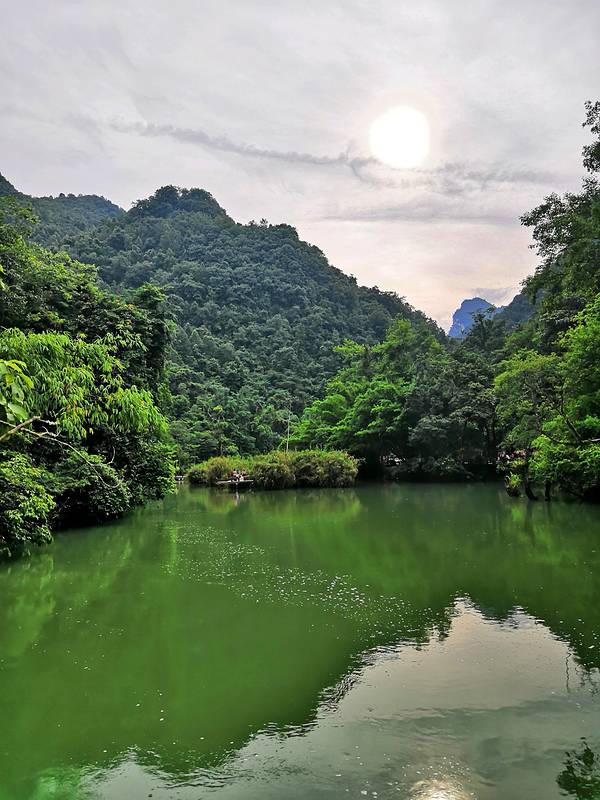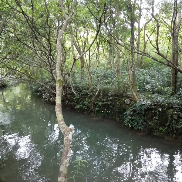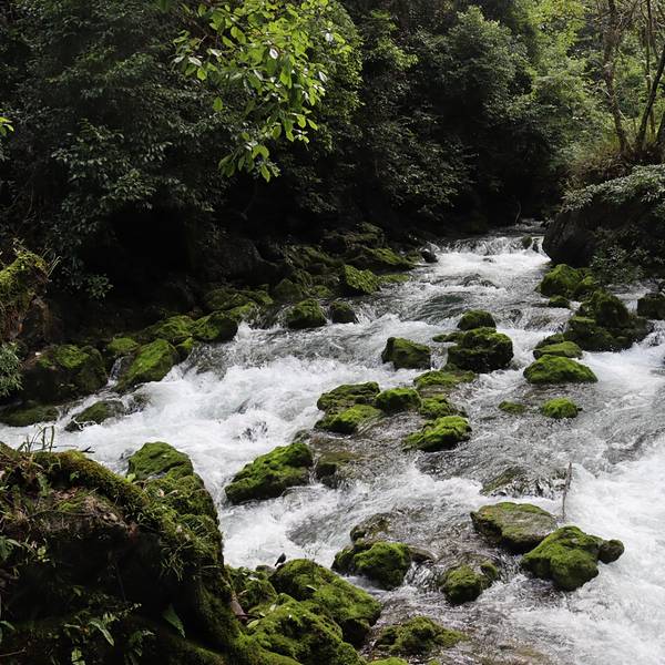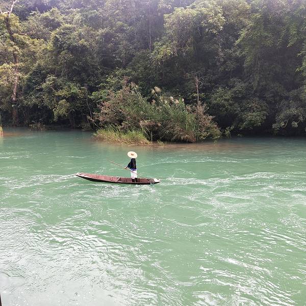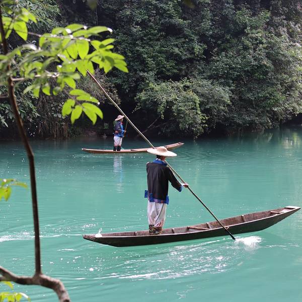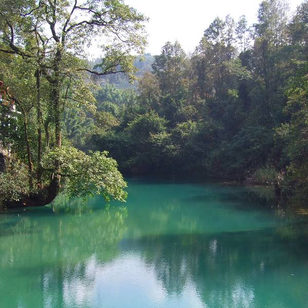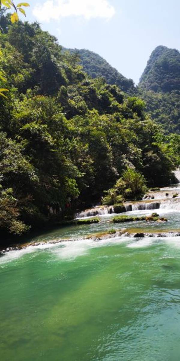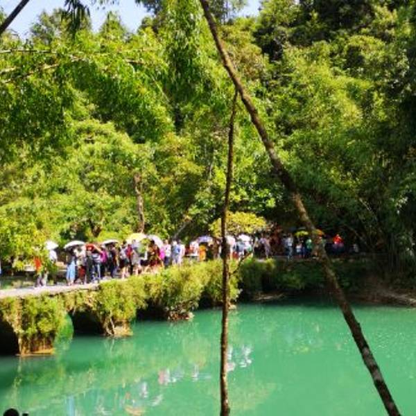 从68级跌水瀑布一路走来,路边驻足的人就越来越多了,随着最后一阶跌水后河流变得平缓,水的蓝绿色也变得越来越沉淀,水中偶尔露出一截朽木或者木桩,驻足观之,很是有一股说不出来的宁静的感觉。顺着静静的河水再往前就到了小七孔古桥,桥体结构没有什么独特的亮点,但是古桥经过岁月的沉淀,青苔藤蔓的点缀再配上这一潭粼粼碧水,两岸的树垂下它们的树枝缠绕在桥体,顿时一种悠然气氛自然而然的就荡漾开来。也许一路都是高山流水,急湍的河流,突然静下来的景致顿时让人心中都被洗涤了一番,只能说走到这里,不虚此行!