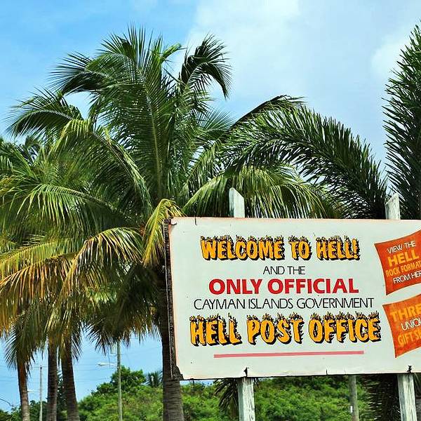 沿着七英里海滩一直往北就可以到达“地狱”,这里有一大片黑色的石灰岩,据说已经有150万年的历史,因为凹凸不平、荒凉又阴森,所以给人地域的感觉。地狱邮局就在黑色的石灰岩旁边,你可以在这里寄一张明信片,会...