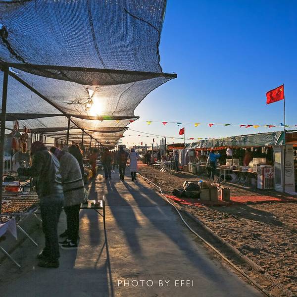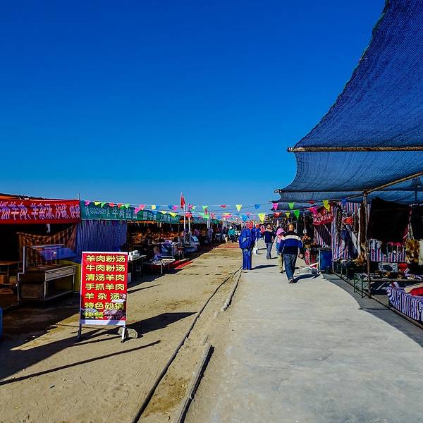 到了八道桥,起码有很大一片吃饭的地方,肚子还...从七道桥出来后,等了一会观光车就到了,先到八道桥看看。其实额济纳胡杨林的八道桥并不是胡杨林,而是巴班吉林沙漠风光,但套票也是包含的,所以还是来看一下吧。