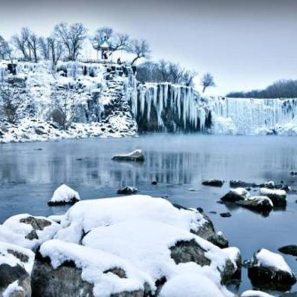 离开欢乐的冬捕现场,来到吊水楼瀑布,我们平时瀑布见得多了,但凝固了的冰瀑还是第一次见。只一眼,时光就仿佛凝固在了那一刻,寒风凛冽,此刻心静得只能听到呼吸。见过了多少次飞流直下,银河落九天的动态美,却从未想过瀑布还有如此的静态之美:极寒之中,瀑布形成一条条美丽的冰柱,仿佛被《冰雪奇缘》里的爱莎施了魔法,被定格成了圣洁的精灵。怪不得镜泊湖瀑布号称是中国最美的瀑布之一呢,每逢雨季或汛期,水声如雷,激流呼啸飞泻,水石相击,白流滔滔,水雾蒸腾出缤纷的彩虹,仿佛仙境。但是在冬季,镜泊湖便会呈现出另外一番不同的景象。
