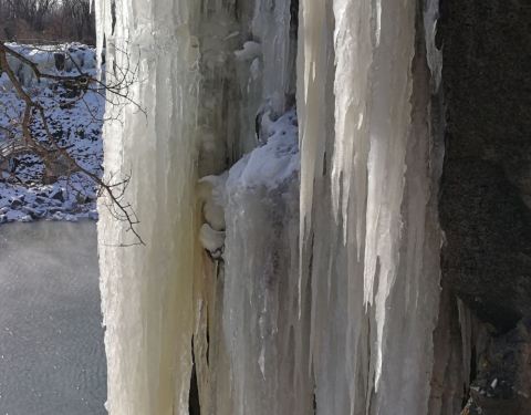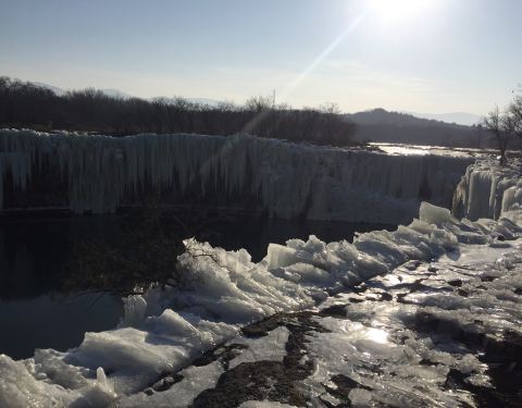 看完了冬捕,我们又赶去不远的地方看冰瀑布,这个地方一样非常的美,跟结冰的镜泊湖是不一样的感觉。我是第一次见到这样的冰瀑,印象十分深刻。这里的瀑布已经停止了喧闹,它不再像难以驯服的野马,而像娴静的少女.此时,它变成了冰挂,那冰挂是透明的,晶莹如玉,阳光照在上面,发出炫目的光彩,十分迷人.冰挂千奇百怪,有的像钟乳石,有的像虬龙,还有的像晶莹的水晶,就像人间仙境一般,使人产生朦朦胧胧的暇想.瀑布两旁的树都挂上了冰雪,好像是给树披上了一件银白色的纱衣,远看简直是玉树玉枝,仿佛千树万树的梨花开放了。