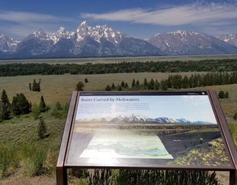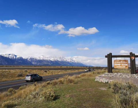 大提顿国家公园。这是公园的打卡处,专门有辅路停车带供游人停车拍照打卡,远处是大提顿的主峰,公路上来往的车辆让牌子更有感觉。 【景色】