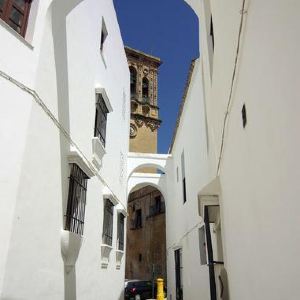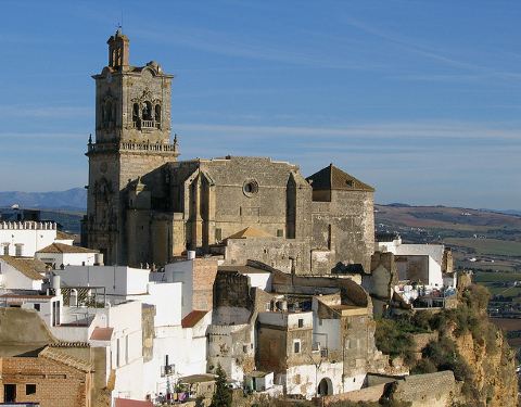 提起悬崖小镇,人们总会在脑海中浮现出龙达的影子,其实坐落在安达卢西亚区加的斯省阿科斯·德拉弗隆特拉小镇也是一座如迷宫般的悬崖小镇。Arcos的悬崖,并不像Ronda那样像是由大自然雕琢打磨的奇山怪石,而像是一块被切了一刀的巨型蛋糕,悬崖几乎是垂直地插入地面,而另外一半则不知去了哪里,“仿佛一片白云突然坠落在悬崖边上”。arco的意思是弧,或者半圆拱。我没能查到小镇得来此名的原因,但走在小镇里,有一道独特的风景是每个游人都一定会注意到的:在老城的中心地带,巷子之间对立的两排楼房的顶上,经常会有大大小小的拱廊将其相互连接,就连哥特式教堂的飞扶壁,也成了小巷顶上的一溜门拱,碧蓝的天空,纯白的墙壁,一弯弯柔和的弧形拱,便是小镇的最大特色。