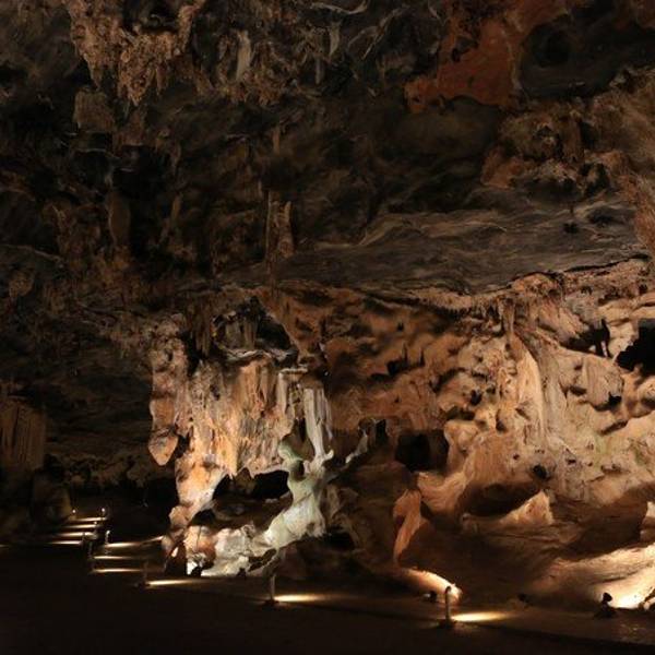 在奥茨颂往北30公里的群山之中有一座规模庞大的天然钟乳石洞叫甘果洞,为非洲较大的钟乳石洞之一。内有钟乳石、石林、石笋等,有些超过十米高的石柱,是历经了15万年的岁月刻蚀的成果。 沿洞穴继续前进,大约在100公尺处有一小石阶步道,顺阶而下,眼前豁然开朗,呈现在面前的是广阔的洞穴,据闻曾有交响乐团在此表演,此洞穴回音效果特佳,并可容纳一千五百人左右。在洞穴四周则有许多钟乳石柱和石笋,甚至有高达10公尺者,考据已达十五万年以上。 沿洞穴后方小路前进,眼前又是一番新景象。在宽阔的空间里有巨大的钟乳石柱、石笋矗立其中,工作人员打开灯光,只见五颜六色的灯光投射在石柱和石笋上,刹那之间,石柱变成了圣母玛丽亚,而岩壁上的石笋不正好是十二门徒。这时交响乐响起,既华丽又庄严。 离洞口大约50公尺处的岩壁上有多幅布希曼人壁画,显示当时即有布希曼人在此居住。因此这里被辟为布希曼人生态区,栩栩如生的蜡像把中古世纪布希曼人生活型态完全表露无遗。当时布希曼人过着群居的生活,他们懂得钻木取火,使用简单的陶器,开始了陶器文明。