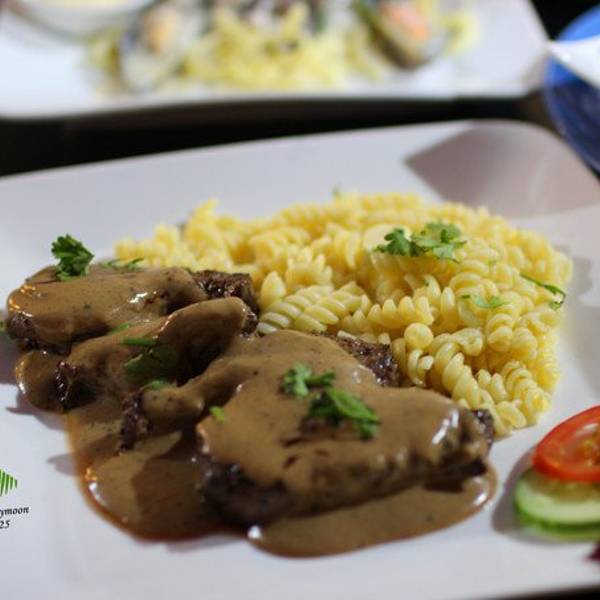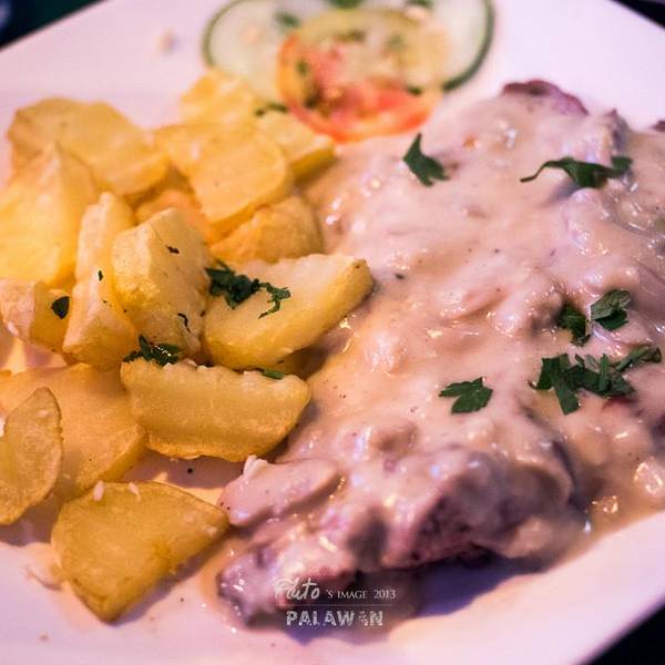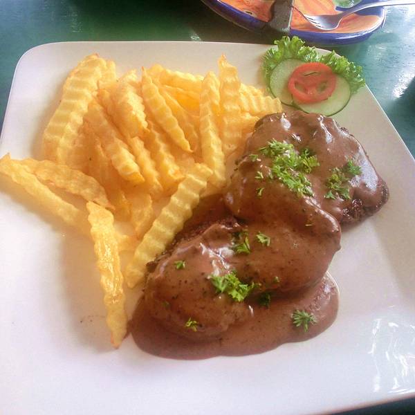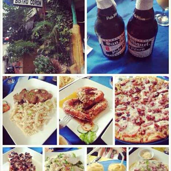 Bistro的披萨和汉堡是科伦人人都爱的食品,此外餐厅还提供汤、意面、海鲜和饮料。牛肉食品也很受欢迎。餐厅的菜单有12页,提供早、午、晚餐还有不少法国菜。这里提供一切食品:沙拉、披萨、意面、肉排、牛肉、猪肉和海鲜。菜量很大,这也解释了他们的菜为什么略贵。辣酱牛里脊,肉烹制的恰到好处,非常软嫩,肉汁美味。不过这里没有菲律宾风味。饮品只有苏打水、少量果汁和咖啡,还有一些酒精饮料,适合想喝通宵的人。尽管上菜速度不总是很快,服务员服务还是不错的。