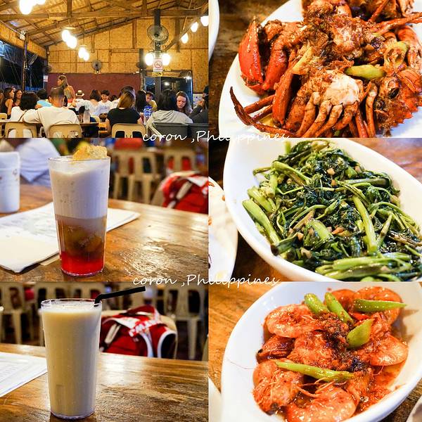 搭酒店免费的车到镇上的LoloNonoy’sFoodstation,也就是小老虎餐厅,同行的两个中国人也刚好是到那里吃饭的。因为绝佳的地理位置,也因为网上各种攻略推荐,这里热闹非凡,如果晚来一步,就需要排队了。在科隆岛...搭酒店免费的车到镇上的LoloNonoy’sFoodstation,也就是小老虎餐厅,同行的两个中国人也刚好是到那里吃饭的。因为绝佳的地理位置,也因为网上各种攻略推荐,这里热闹非凡,如果晚来一步,就需要排队了。在科隆岛呆了这么多天,这里是唯一一家有中文菜单的餐馆了,可想而知它是多么吸引中国人前往啊。事实上,它的出品不算很好,可是论是否符合中国人的口味,它绝对是我试过这么多家餐厅里的第一位。投其所好,这也是餐馆的策略。这里的mangoshake,是最美味的,也是值得推荐的。下面这杯长得很有特色的,叫做halohalo,果冻、罐头水果、牛奶沙冰,点缀上一块芝士,煞是好看。这也是菲律宾的特色饮品了,我感觉这个可以称为菲律宾的烧仙草吧,就是什么都有一点。好不好喝,等你们亲自尝尝~辣炒螃蟹,蒜蓉虾,炒空心菜。这样的菜式,不正是我们喜欢的做法吗?蒜茸虾新鲜鲜甜,螃蟹就远远不及了,我们都觉得螃蟹不是新鲜的,可是我,还是吃完了。然后祈祷今晚不要肚子疼,哈哈哈~