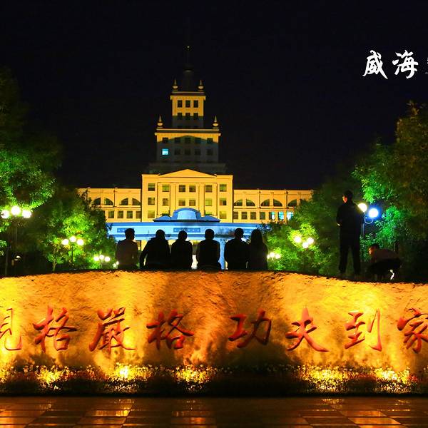哈工大威海校区,门外就是免费的金海滩浴场,校园内的景色还不错,有各种花卉,像杜鹃牡丹樱花迎春,平时可以用来晚饭散步,还是不错的地方。另外,校园内有一家西餐厅