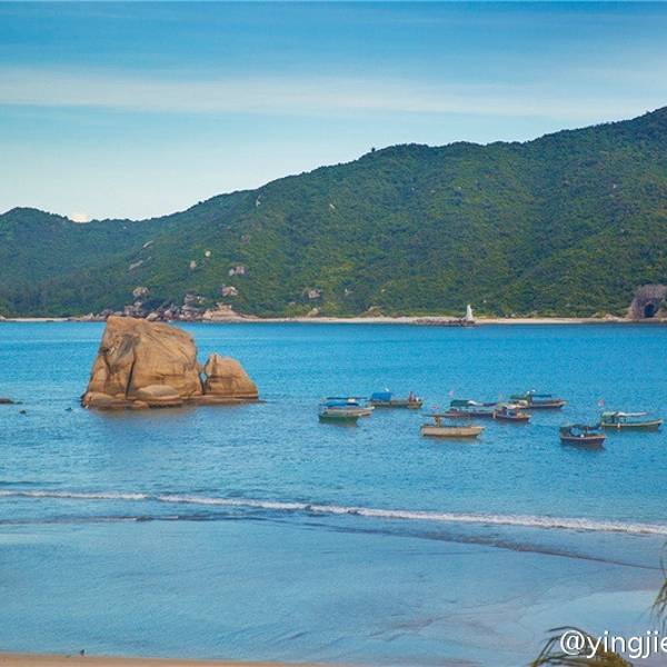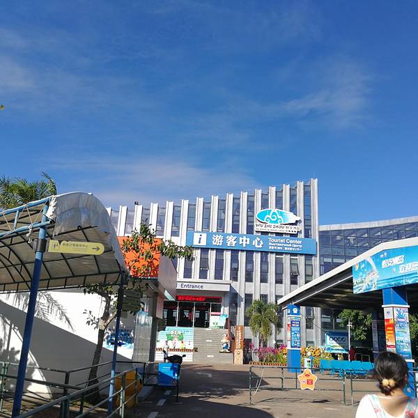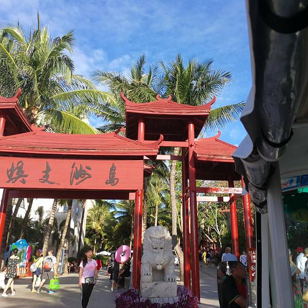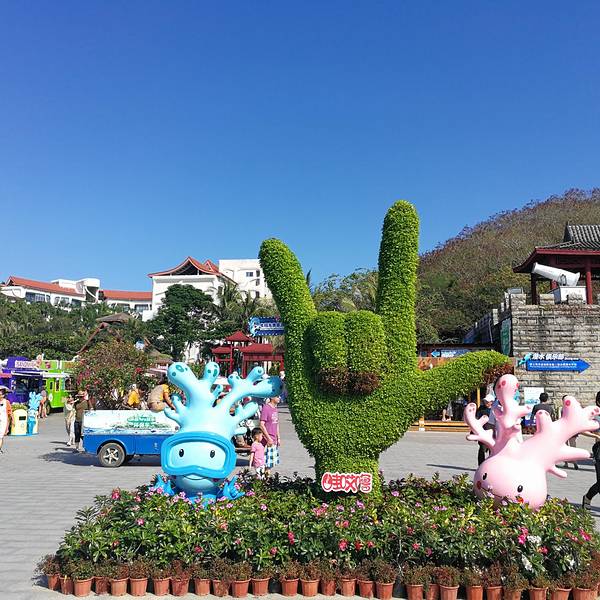 岛的旁边是个小村子,最早看的住宿应该都是这里的。不大,但是商业化气息很浓厚下车,经过蜈支洲岛的大门,先去村子里买点东西。都说岛上的东西太贵了从大门走进去,就是游客中心进来办理入住手续,就可以走VIP通道了这个点上岛的人不多,应该都是住宿的。不然下午5点半最后一班游轮是赶不上的遇到了大批离岛的游客,一般是上午10点到达,玩3-4个小时,下午离开坐上游轮进岛,大约15分钟。不过10来个人,很痛快的坐在了前面,宽敞风景好啊。没想到的是,前面颠簸,容易晕船(听女儿说的,哈哈)玩累了你们,看不出高兴的样子下了船,在这里等候电瓶车。可以享受酒店的VIP待遇,不用排队坐电瓶车进去,十分钟到酒店。电瓶车的喇叭是一小段好听的声音,“Wa ai lu”,它为蜈支洲岛所特有,其音“瓦爱鲁”就是“我爱你”从坐电瓶车的地方看美丽的小岛等电瓶车的时候,也不无聊,有各种好吃的好玩的