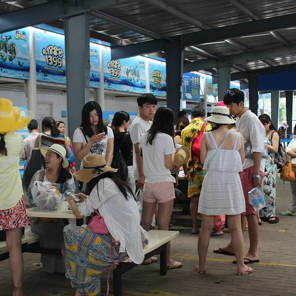 - 玩累了你们,看不出高兴的样子。等电瓶车的时候,也不无聊,有各种好吃的好玩的。下了船,在这里等候电瓶车
