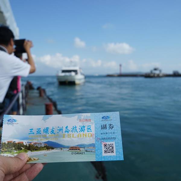 因为我们没有租车,为了交通方便,我们报了蜈支洲岛当地一日游,包含酒店到蜈支洲码头的往返接送服务和景区门票。早上八点多大巴就到酒店门口来接我们了,从酒店到蜈支洲岛大巴开了大概1个半小时,是我们在三亚的这几天中行程最远的一次。景区门票是实名制取票的,所以小伙伴一定要带好个人有效身份证哦。在此不得不吐槽一下蜈支洲岛的票务管理,仅仅排队取票就花了我们1个多小时,而且现在还还是淡季,真不敢想象旺季要排多久。从蜈支洲岛码头乘坐气垫船上岛是进岛的唯一途径。蜈支洲岛的游客非常多,旺季排队至少要一两个小时,建议大家尽量早一点到这里。蜈支洲岛的游船每天早上8:00开船,下午16:00最后一班船上岛,下午17:30当天最后一班船离岛,但每天最后一班上岛、离岛的时间也并非一成不变,而是会根据当天的天气情况而调整的。坐船全程大约15-20分钟。晕船的小伙伴要做好心理准备,其实稍稍坚持一下就到目的地了。奇怪的是大莹这次居然一点没晕船,真不敢相信这是当年那个在邮轮上晕的七荤八素的家伙,反而这次我却晕的不要不要的。