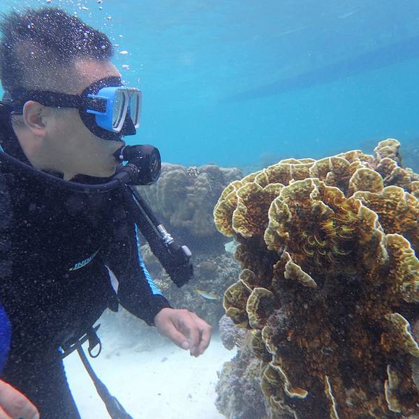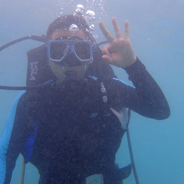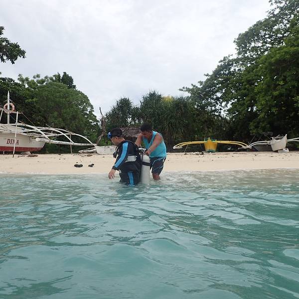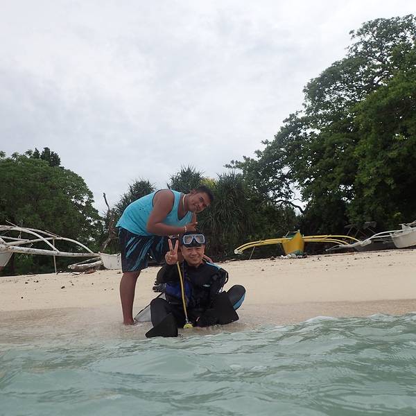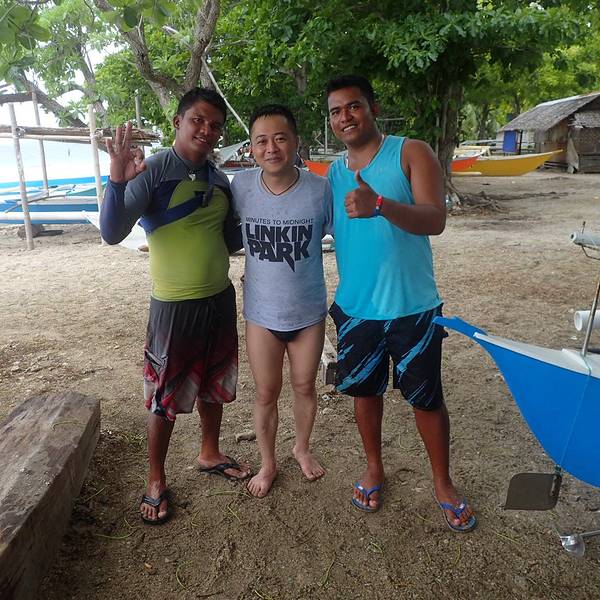 船到了巴里卡萨岛,总算一路平安,他们三人居然带我到了一家渔民的家里,顿时让我感觉这事太不靠谱了,连个正规的潜水店都木有,出事怎么办?可是来都来了,也没办法啊,于是硬着头皮,换上潜水服,氧气瓶。回头看看自己的衣物,有钱包,有手机…………阿龙说他帮我保管,好吧,貌似我也没有其他人可以更信任了。岛上的海景着实是漂亮…………即使是阴天这就是阿龙的螃蟹船。岛上的居民过着简陋而朴实的生活,从他们的眼睛里,看不出丝毫的不友善,这让我稍稍放了些心。准备下水。潜水教练是个挺憨厚的小伙子,名字叫bebaby。他反复告诉我要信任他,虽然这之前有过深潜的经历,可是那天我下了2次都示意快点上去。第三次下潜,不再有紧张情绪了。都不用太深,还低2-3米,就是另一番世界,仿佛置身另一个星球。不同颜色的小鱼一簇一簇的游来游去,也不怕人。有2只尼莫躲在珊瑚下面,bebaby示意我用手去碰,2只尼莫跟我捉迷藏,穿梭于珊瑚间,让我找不见。继续下潜,鱼儿成倍的增加,种类也较之前多出许多!往下一看,我的天啊,是个断层,断层下面黑洞洞不见底,此事看潜水表,已经21米了。由于换装的时候心里紧张害怕,潜水手套没带,bebaby让我用手摸珊瑚,结果还被蛰了一下。这里面是一个大山洞,往里瞧黑漆漆的,真有些吓人,因为你根本不知道下一刻从里面出来的是什么东西。在洞口,居然发现一只海龟,实在是太幸运了。后来问旅行团,当天一大早出发,即没有看到海豚,也没看到海龟,更没有深潜这个项目。更加庆幸自己的决定,即没有耽误休息,又玩到了深潜。我去摸了一下海龟先生鳍,被他很有力的蹬开了,表情非常不屑和厌恶,仿佛在说:老子刚想休息一会,你干嘛来烦我!于是,他头也不回的向深海游去,留下我和bebaby,意犹未尽的看着他远去…………这种小鱼紫的都发光,可惜相机拍不出那种震撼的感觉。图片右边就是黑洞洞的断层,那下面至少我是没看到底。左边的就是blebby,右边的是助手,帮我穿潜水装的那位,2个人都不赖。 展开