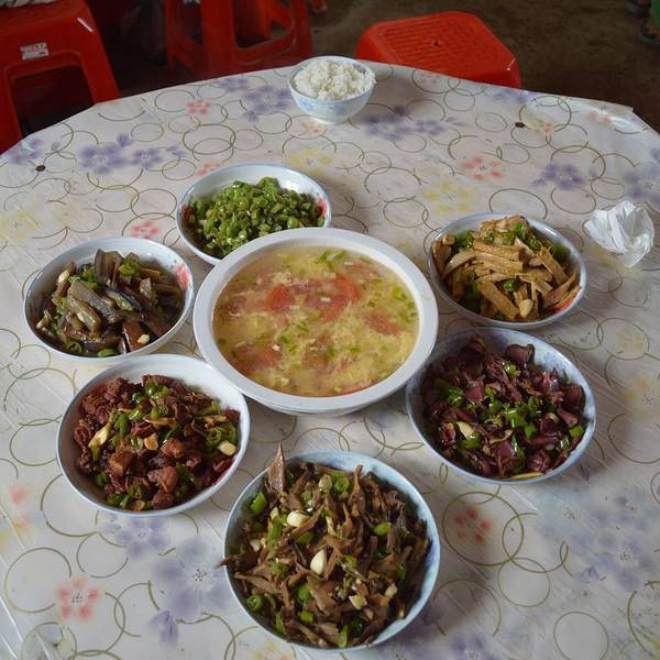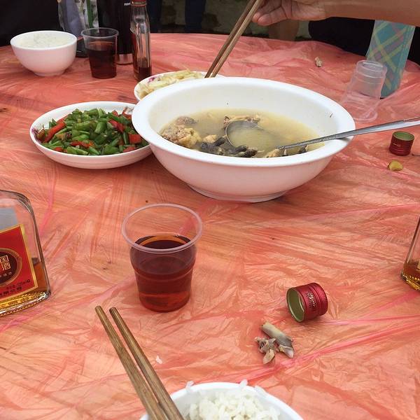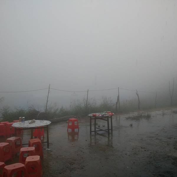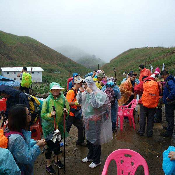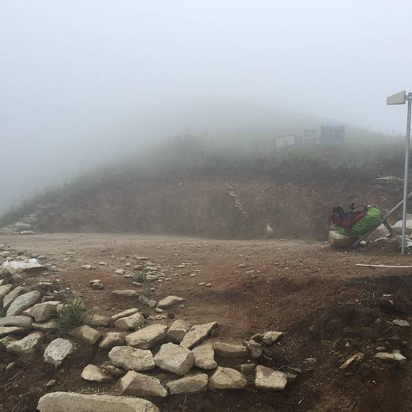 老板马上端上饭菜,饥肠辘辘的三个人喝了开水,吃起饭来。现在雾越来越浓,能见度非常低。怎么走都能走到休息没有多久,天开始下起了小雨……看来天气预报的雷阵雨,果然不是空穴来风!由于距离客栈还有15分钟,大家纷纷收拾行李继续赶路。希望在大雨没有来到之前。回到客栈!