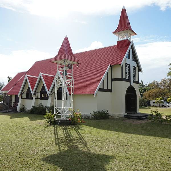 下车就看到这座红顶教堂,我记得他应该是法国还殖民毛里求斯的时期建造的圣母教堂,所以看到它,立刻就能感受它浓浓的浪漫气息。在正门上面就会有看到窗框,这与教堂内部的木结构相互连接,这种杆状结构勾勒出了一个大的十字架。法国工程师为这里设计了人字形的木桁架,这使得这个教堂看风景能够无视线遮盖,也使得小教堂的空间比看上去大得多。在屋顶上开的那一扇窗户叫做老虎窗,能够从纵向结构上稳定建筑物。这里面的椅子也漆成了红色,与屋顶的颜色相一致。红色也是毛里求斯人眼中的民族色彩,与他们的国旗上的红条色块一样。整体建筑采用的色调是白色的墙面,红色的屋顶,绿色的草坪,不远处是蓝色的海洋,几种色彩相互映衬,有一种难以言说的美感。