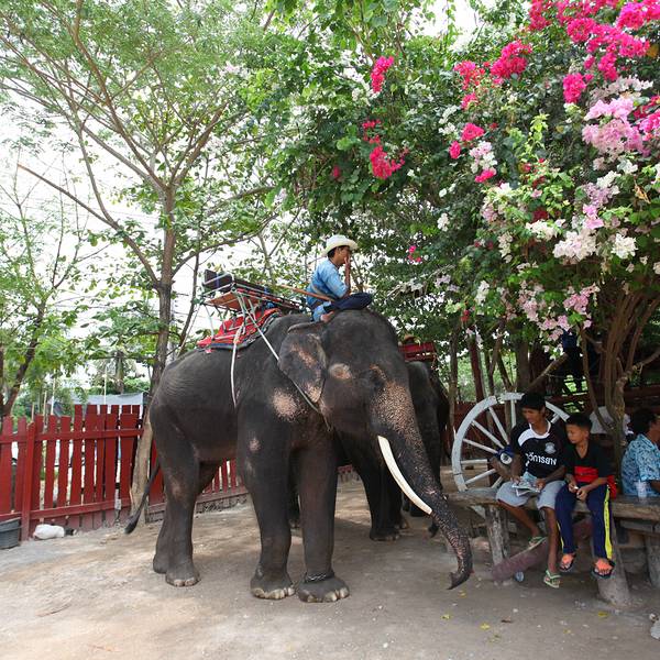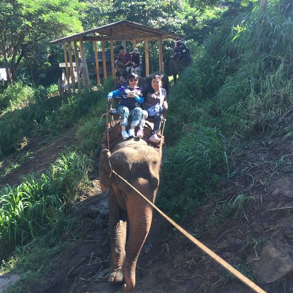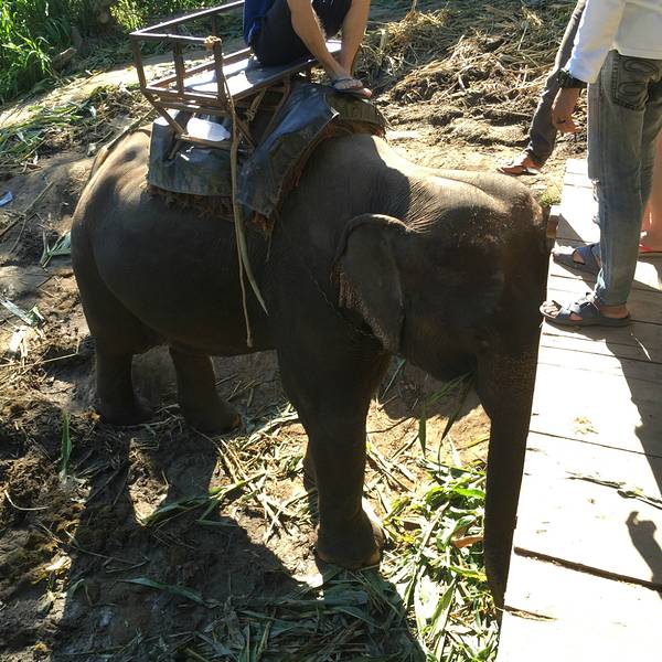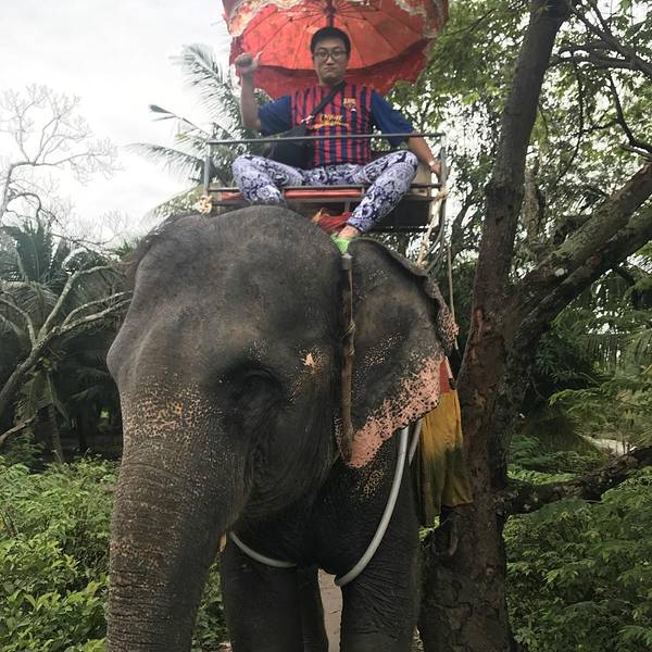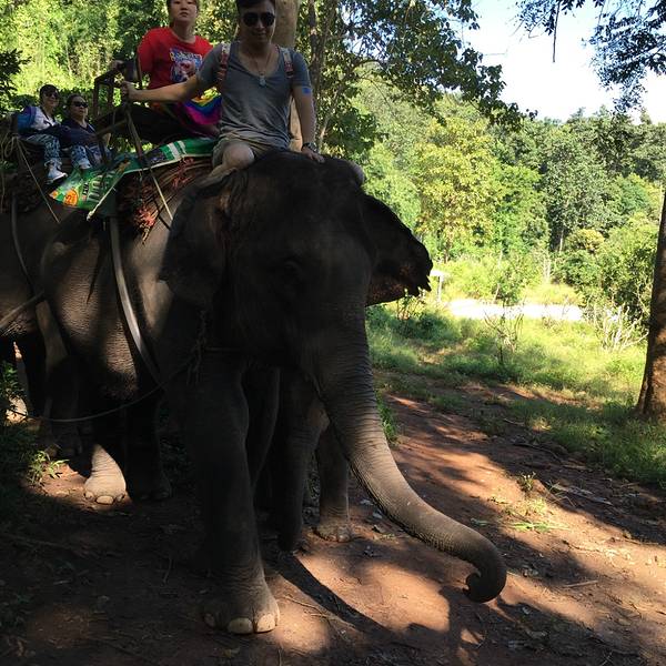 来泰国骑大象当然是一个必游的科目。这次趁着一日游的机会,正好感受一把。 常普克大象营是丹嫩沙多水上市场附近的一座大象营,从水上市场开车过来大约需要15分钟。然而这座大象营距离曼谷市区有将近100公里的距离,不知是否有直达的巴士可以乘坐,而据导游讲,从曼谷市区包车到这里,最少也得500人民币,人少的话个人还是建议报团比较划算。 常普克大象营骑象,大象绕场一周的费用是500泰铢。游客可以自费50泰铢购买食物喂大象。而最终骑象后,还需要给训象师50泰铢的小费,因此一圈整个下来花费600泰铢,折合人民币120元。 骑象时就坐的座位被安装在大象的背上,是一个钢制的两人座架子,座位上铺设这柔软的坐垫,座位上面有一个大伞帮助遮阳,手脚也皆有可以扶的地方,整体来说舒适感还不错。 上座位时,训象师会将大象停在一个与象背平齐的平台旁边,客人从隔壁的楼梯抵达平台后,踩着象背进入座位,当客人坐好后,训象师会插上座位前方的铁销子,以保证安全。正常情况下,每个座位上会坐上两个成年人,当然有时候也会根据情况安排一人单独乘坐。 值得注意的是,由于座位不能完全稳固的安装在象背上,骑上大象后,座位会小幅度的左右摇晃,坐在4米高的象背向下看,还有会有些恐怖的。不过座位安装的很牢固,安全倒是不用担心。 骑上大象后,训象师会引导大象按照指定的路线走一圈,指定路线包含过河,原始丛林以及香蕉园,中间训象师还会主动爬到树上给游客照相,当然小费是必不可少的。整个骑象过程大约会耗时15-20分钟,不长不短,很有特色。 总体来讲,对于从没骑过大象的我,这是一个既新鲜又刺激的活动,值得体验一次。然而,常普克大象营距离曼谷市区较远,从距离上来考虑,更适合正好来丹嫩沙多水上市场游玩的客人。