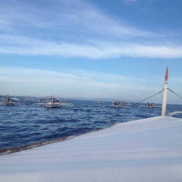 5:30从阿罗那海滩出发,到传统的海豚观测点——帕米拉坎岛(Pamilacan Island)附近海域需要大约40分钟的时间。追逐海豚是相当有意思的一件事情,几十艘船集中在一片海域,如同粉丝盼望明星般殷切期待着海豚团队的莅临。