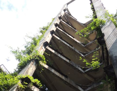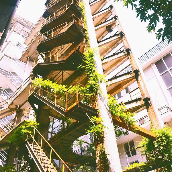 1850创业园内唯一保留的双氧水厂建筑就是这一栋了,杂乱狂生的杂草向上攀爬,就这样悄悄地缠绕建筑的柱子,生锈的楼梯已经被栏杆隔离无法进入,也许你不轻易碰到铁楼梯还会飘落不少绣铁碎片,此刻阳光正慵懒地洒在楼梯间,工业历史的味道久而不会散去。