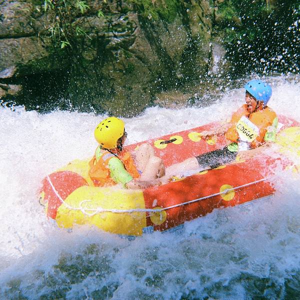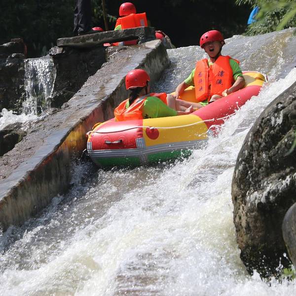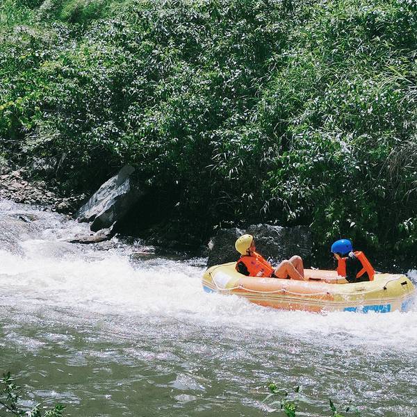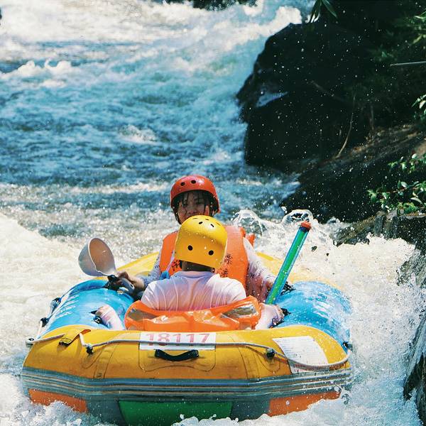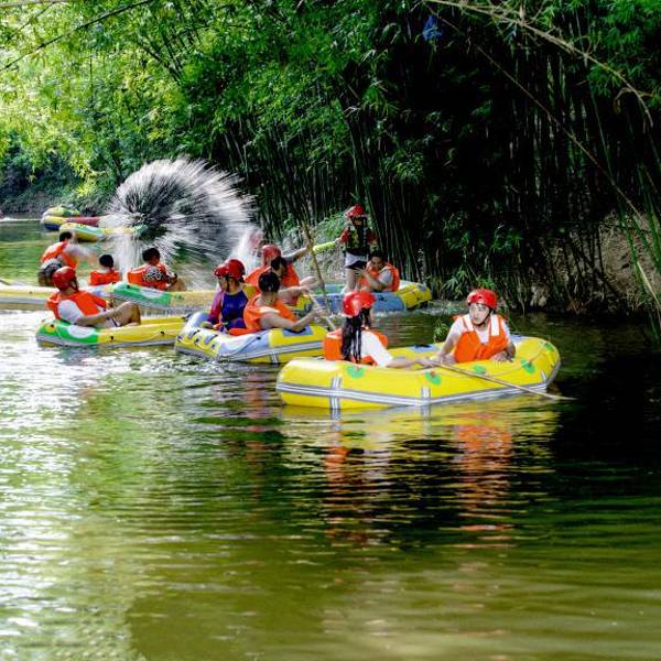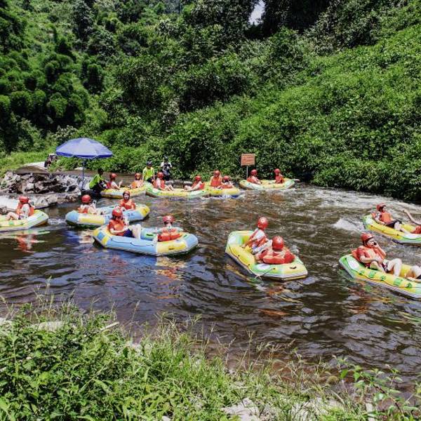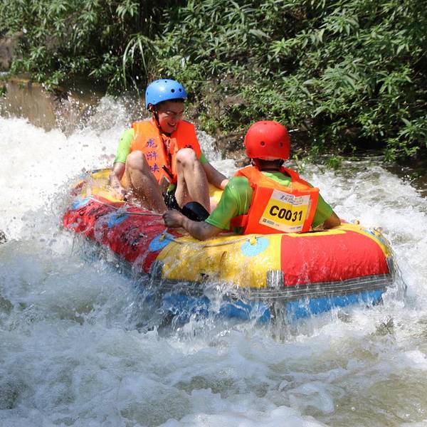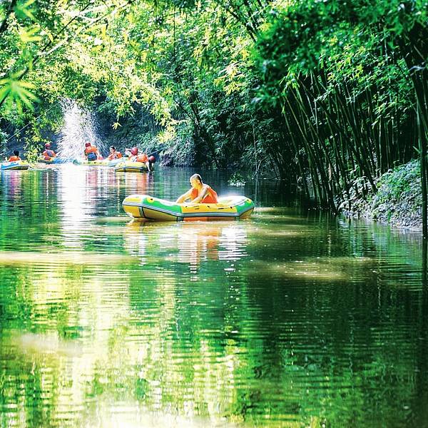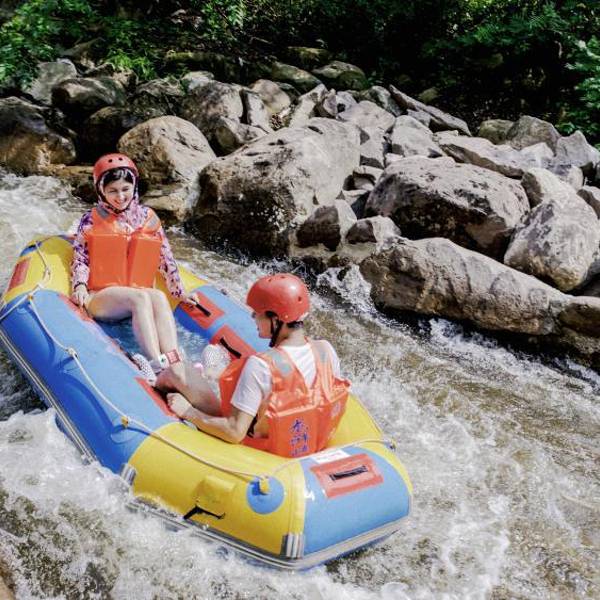 3.河道分为刺激与平缓的两段区域,上半程连绵不断的落差和险滩,回旋激荡刺激无比,胆小的朋友也可以玩后半程,在竹林中赏景戏水也是可以的!全家人也能漂流哟~