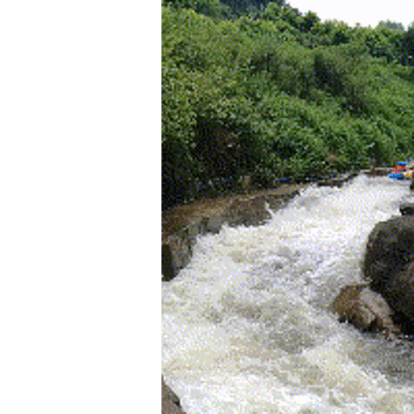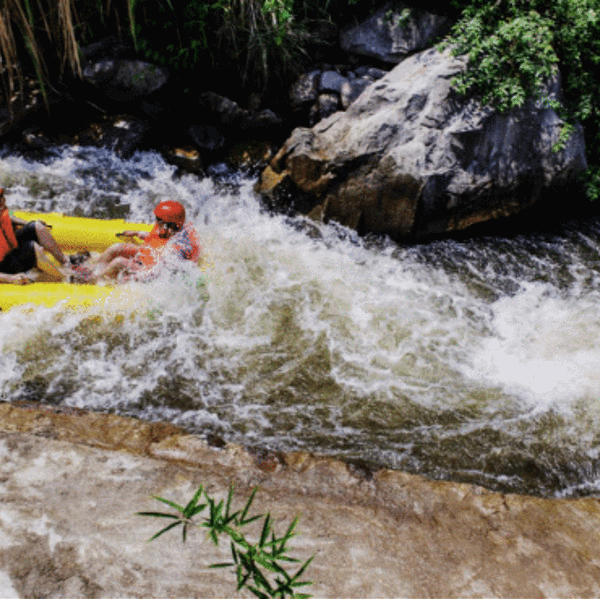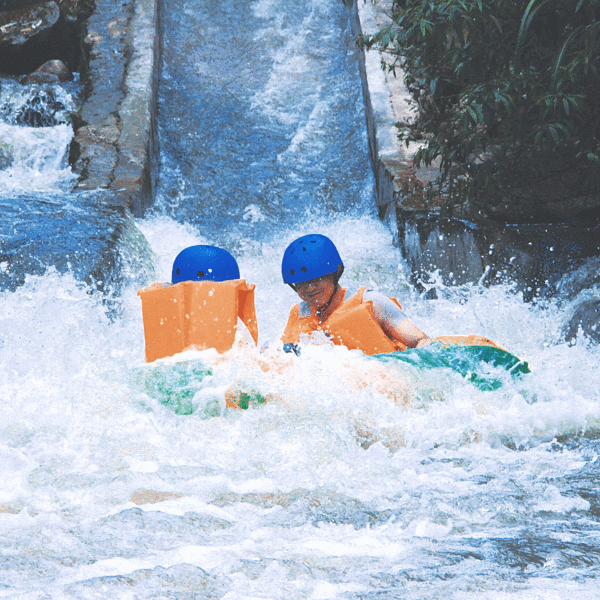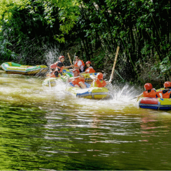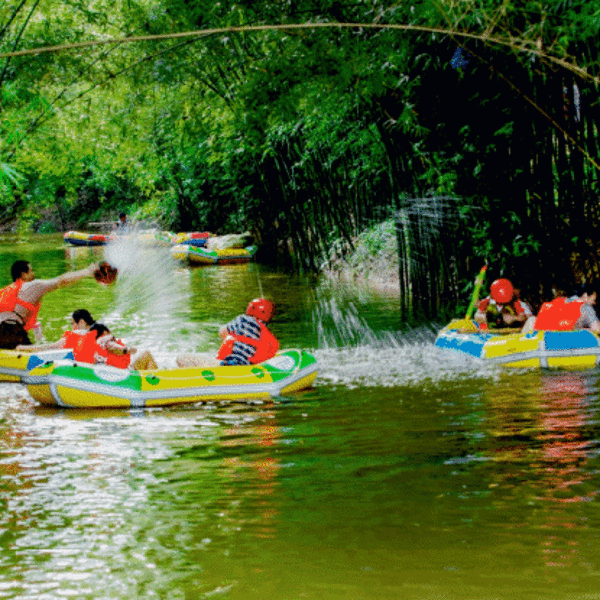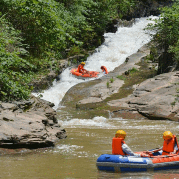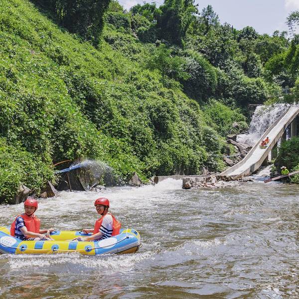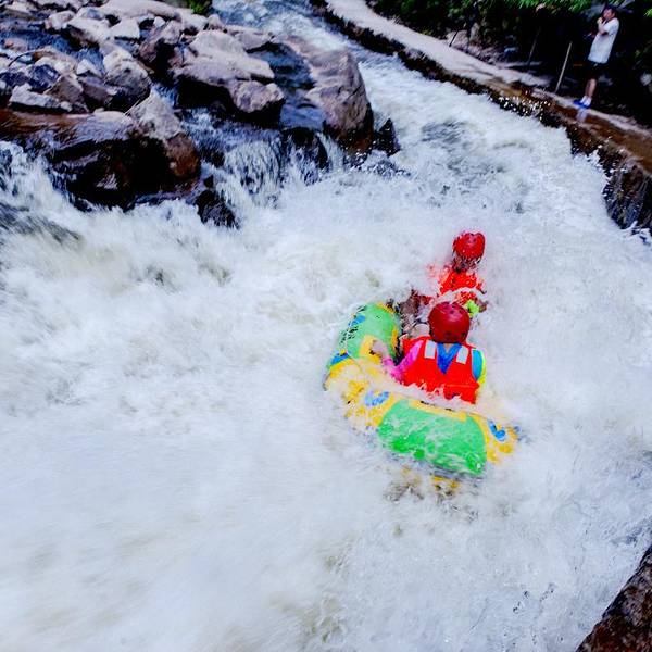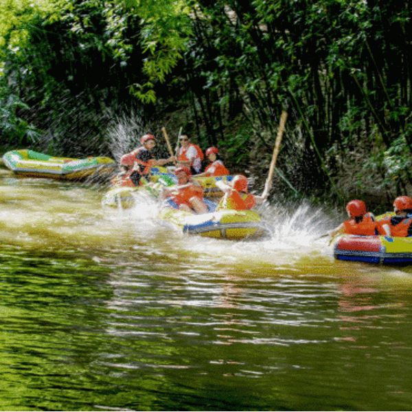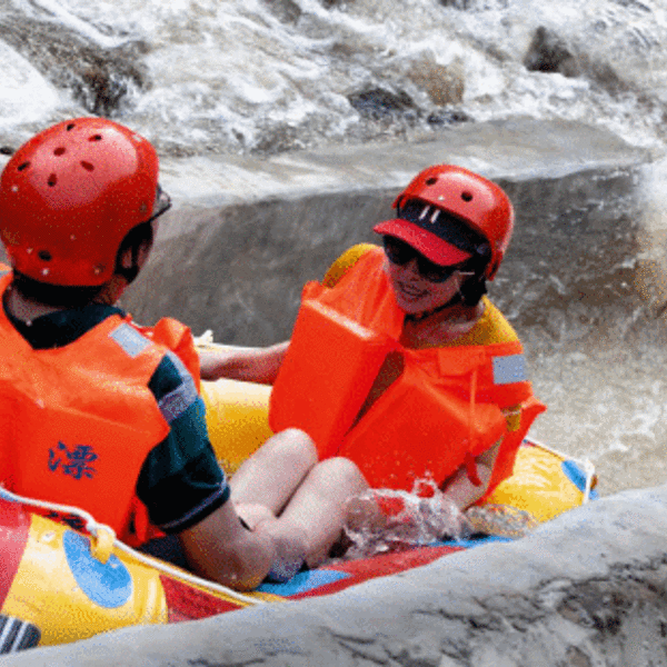 3.河道分为刺激与平缓的两段区域,上半程连绵不断的落差和险滩,回旋激荡刺激无比,胆小的朋友也可以玩后半程,在竹林中赏景戏水也是可以的!全家人也能漂流哟~