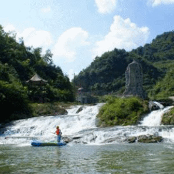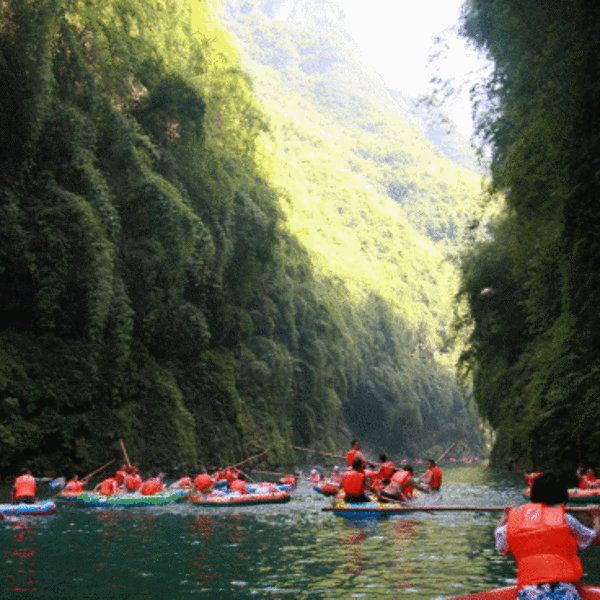 地处重庆彭水县,依附于全长13公里的阿依河。其峡深谷高,河床狭窄,清幽绿水,两畔花香鸟鸣,人泛舟于江上仿若驶进桃花源,置身曼妙天堂。这里的漂流和人们印象中的激流勇进有所不同,全场约9公里,相对不会那么刺激,比较适合大众普遍自身情况。在漂流中你可以欣赏到阿依河原生态的自然景观,深不可测的溶洞,庄严肃穆的石佛像,待到下游还可以体验一番这里独有的苗族土家族民俗风情。一般推荐在这里停留两天才得以游览尽兴,入夜之后还可以参加当地的篝火晚会,彭水的美食就更别具一格了。荞面豆花、嘟卷子、还有心肺米粉,每一样都可让你吃到大汗淋漓畅快无比。