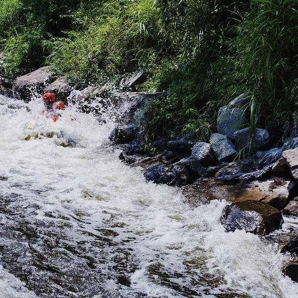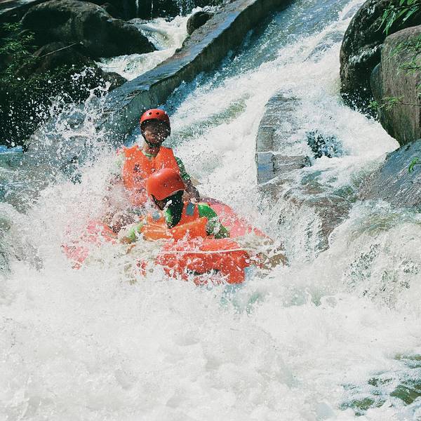 龙浒峡依托龙岗大型水库外加自建的水库,形成了上游最大高度15米的落差,被称为“猛士河段”。连续激流勇及一千多米,耳旁尖叫声不断,让你从另类角度充分体验山水重庆的回旋激荡。在也只有在这里,你被湍流高高托举,眼前只有被龙浒峡谷围绕的一方蓝天和不停往脸上拍打的水花,凉意十足,酣畅淋漓。静谧下游,绿竹密林河道亲子漂流