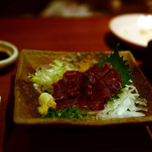 其实已经10点了,但是商场里的饭店依然还在营业,还有很多加班的上班族在这里吃饭。千庭的华丽就在于这个熊本名物——马肉刺身!!