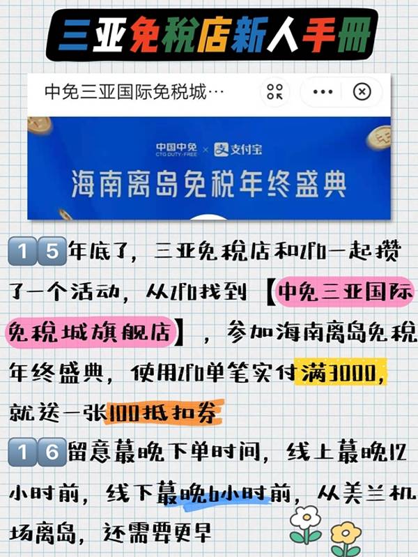 📌年底了,三亚免税店和zfb一起攒了一个活动,从zfb找到【中免三亚国际免税城旗舰店】,参加海南离岛免税年终盛典,使用zfb单笔实付满3000,就送一张100抵扣券