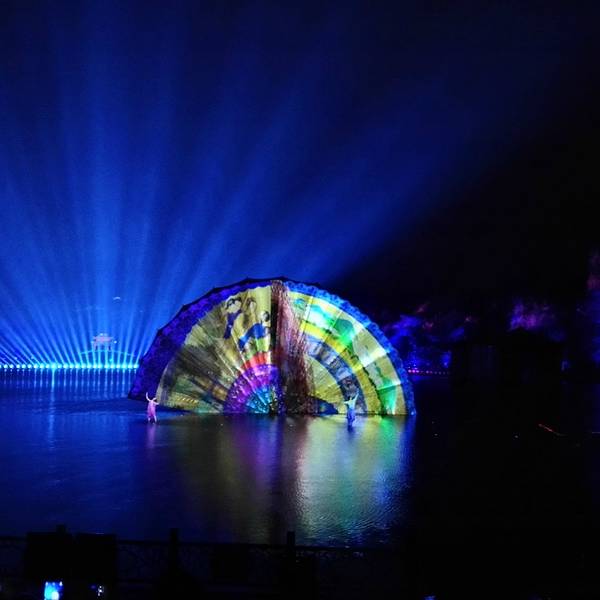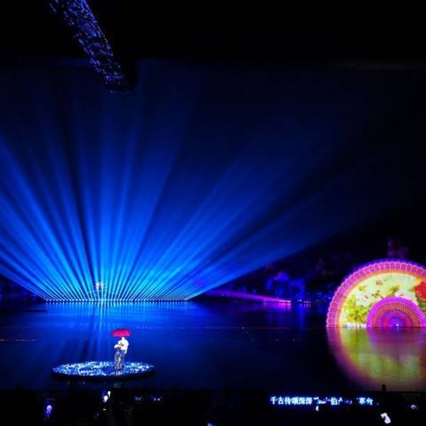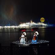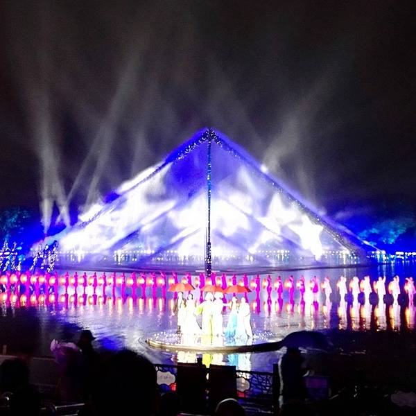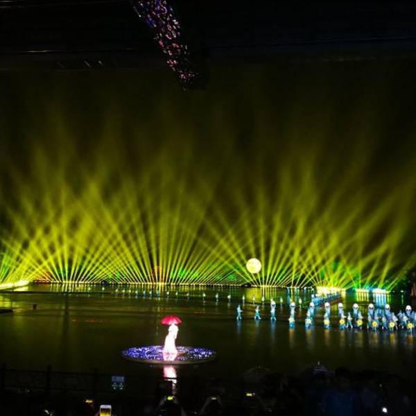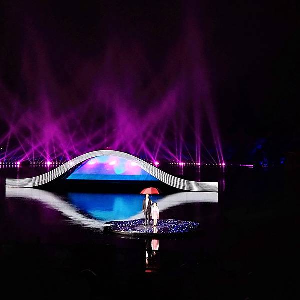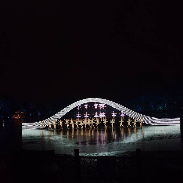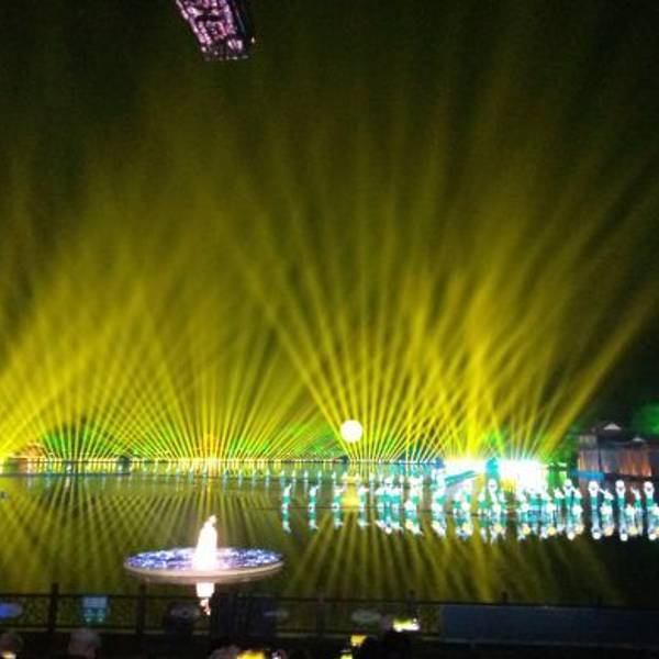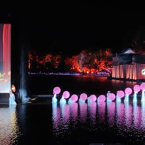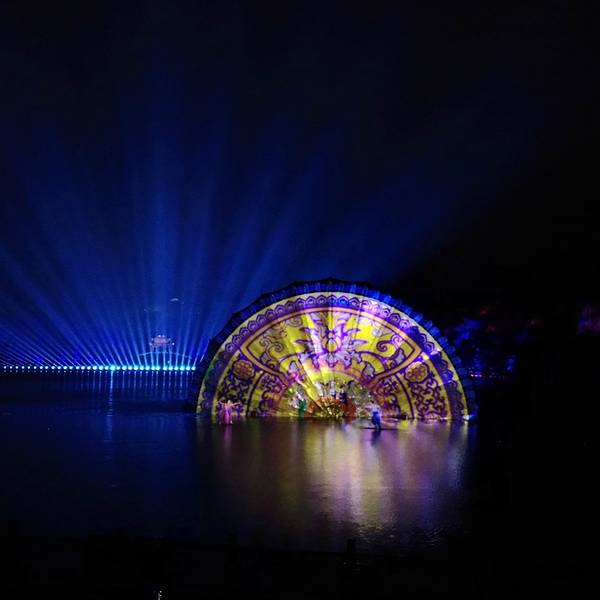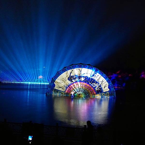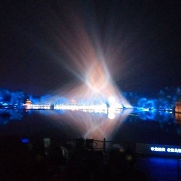 3.整个表演给我的感觉还是很震撼的,但是区别于以前看过的丽江印象,这个似乎没有那么气势磅礴,而是从一个很细腻的角度抓住你的内心,回荡在空气的音乐是那种不能说是悲壮,但确实有很凄美的那种感觉,去之前也没做功课,当时就是看热闹,回来网上查才知道讲的是什么,建议去之前先查,这样看的时候更加有共鸣,张靓颖空灵的声音对整个演出起了一个升华的作用,大型的水幕效果做的真的很棒,视觉冲击还是很震撼的,最后升起的有点水屋效果的,搭配了五颜六色的光影,还有很多的水雾,感觉很迷幻,从视觉和听觉都推向了高潮。