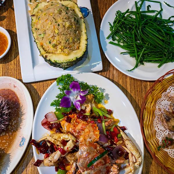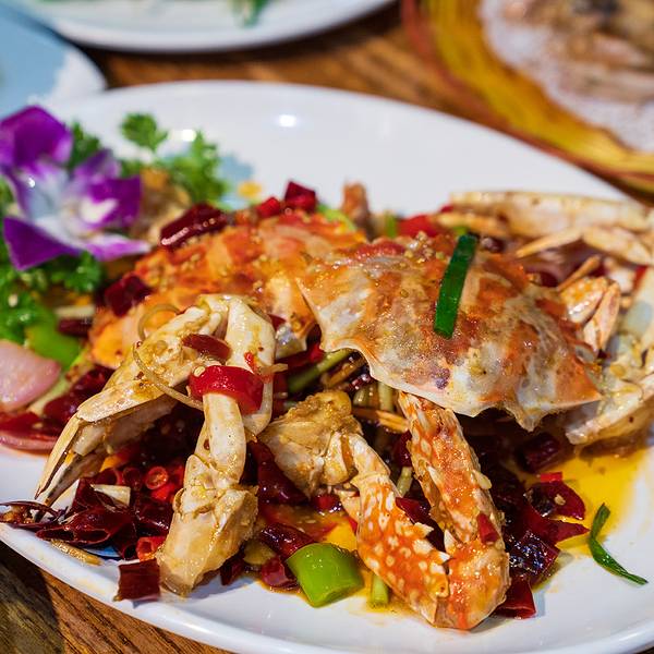 逛了一上午,已经饥肠辘辘了,在网上搜了下周边的美食,真好有一家榜上有名,而且这里可以选择新鲜的海鲜,然后再去加工。琳琅满目的海鲜,张牙舞爪的螃蟹就有十余种,还有老虎斑,各种鱼类、贝类、海虾……我们...逛了一上午,已经饥肠辘辘了,在网上搜了下周边的美食,真好有一家榜上有名,而且这里可以选择新鲜的海鲜,然后再去加工。琳琅满目的海鲜,张牙舞爪的螃蟹就有十余种,还有老虎斑,各种鱼类、贝类、海虾……我们挑了好多种,准备找一家去加工。因为我和闺蜜喜欢吃川菜,所以一眼就锁定了这家,香辣蟹、芒果螺、 波士顿 龙虾、蒜蓉粉丝扇贝、菠萝饭、四角豆、白灼基围虾。这家有一点特别赞,店员会主动用热水给客人将餐具烫一下消毒,而且有自制的免费酱料,咸甜口的,配 上海 鲜吃,很鲜香。吃海鲜最好的方式就是用手,如果担心会弄的手上很脏,店里还提供一次性手套,很贴心。清蒸基围虾:基围虾的做法很多,白灼、椒盐、姜葱、辣炒,可以选择其中一个口味,也可以一虾两吃,建议尝试辣炒的做法,毕竟香辣是小胡子家的特色嘛,白灼有专门的蘸虾的调料,但是个人觉得完全可以不蘸,因为本身虾就很新鲜了,原汁原味的味道最好了。蒜蓉粉丝蒸扇贝是最常规,也是最经典的吃法,新鲜的扇贝,加上粉丝、蒜蓉,清蒸后,再撒上香葱,最后淋上热油。香辣蟹,最好吃的一道菜,酱香浓郁,青椒洋葱,香辣的味道也没有掩盖肉质的新鲜,正值红花蟹肥美的时候,入口先是浓郁的香辣味道,将蟹壳剥开,能吃出蟹肉淡淡的甜味.香辣蟹,最好吃的一道菜,螃蟹成熟的季节是国庆节后,目前 三亚 的螃蟹主要分和乐蟹和红花蟹,和乐蟹具体分大和乐蟹和小和乐蟹,想吃蟹黄一般是选小的,用来做香辣蟹,而大一些的和乐蟹比较好看,美观,肉质比较鲜美,但是一般蟹黄比较少吃到,两者在价格上,大的肯定要比小的贵,但是喜欢吃蟹黄的,推荐小的。酱香浓郁,青椒洋葱,香辣的味道也没有掩盖肉质的新鲜,正值红花蟹肥美的时候,入口先是浓郁的香辣味道,将蟹壳剥开,能吃出蟹肉淡淡的甜味。如果赶上没有蟹黄的季节去吃螃蟹,那么螃蟹的做法最推荐的还是香辣蟹,非常的入味,而且新鲜的螃蟹即使被爆炒后,仍然可以吃到肉质的细腻和甜味来。还有好吃的 海南 菠萝饭,黄瓜,红萝卜,鸡蛋,香葱,还有菠萝丁,满满一大份的 海南 菠萝饭,可以够2—3人的食量。个人觉得菠萝饭搭配自制的海鲜酱料拌饭吃,特别好吃!如果像这样一大桌子菜,两个人吃没有那么大食量的话,可以点小吃类的椰子糕、椰子饭,份量小份,还可以多品尝几种。芒果螺吃过很多种做法,最好吃的还是香辣爆炒,但是这家还加入了小米椒、香葱、洋葱,色泽红润,味道鲜美